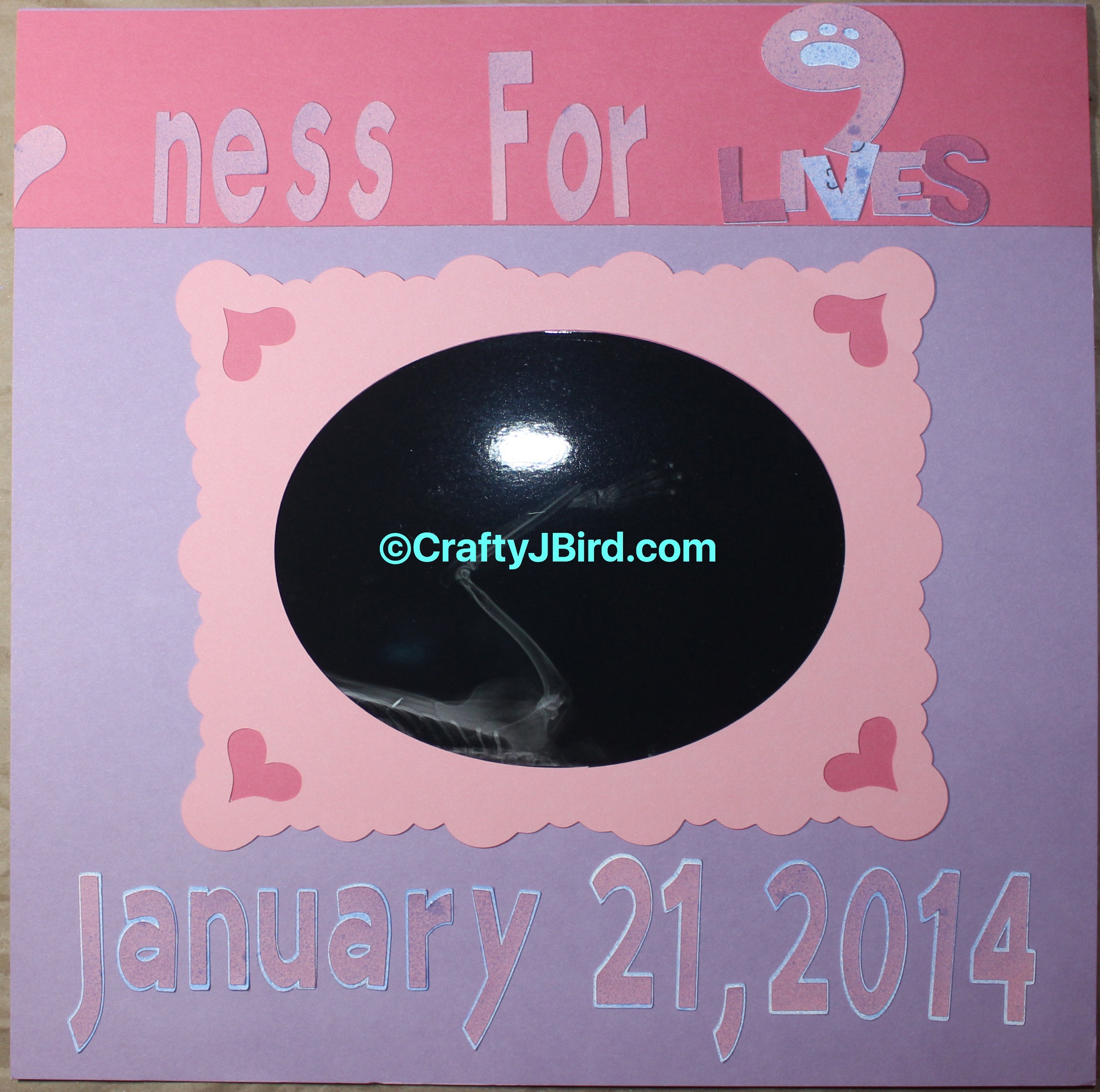 When I put this layout together, I wanted it to be ‘happy’ even though it was a sad, sad thing that happened; so I used purple and pink cardstock mainly to put it together. I used the Cricut Expressions to cut out my frames and where I have it saying ‘9 Lives’ together at the top on the right page.