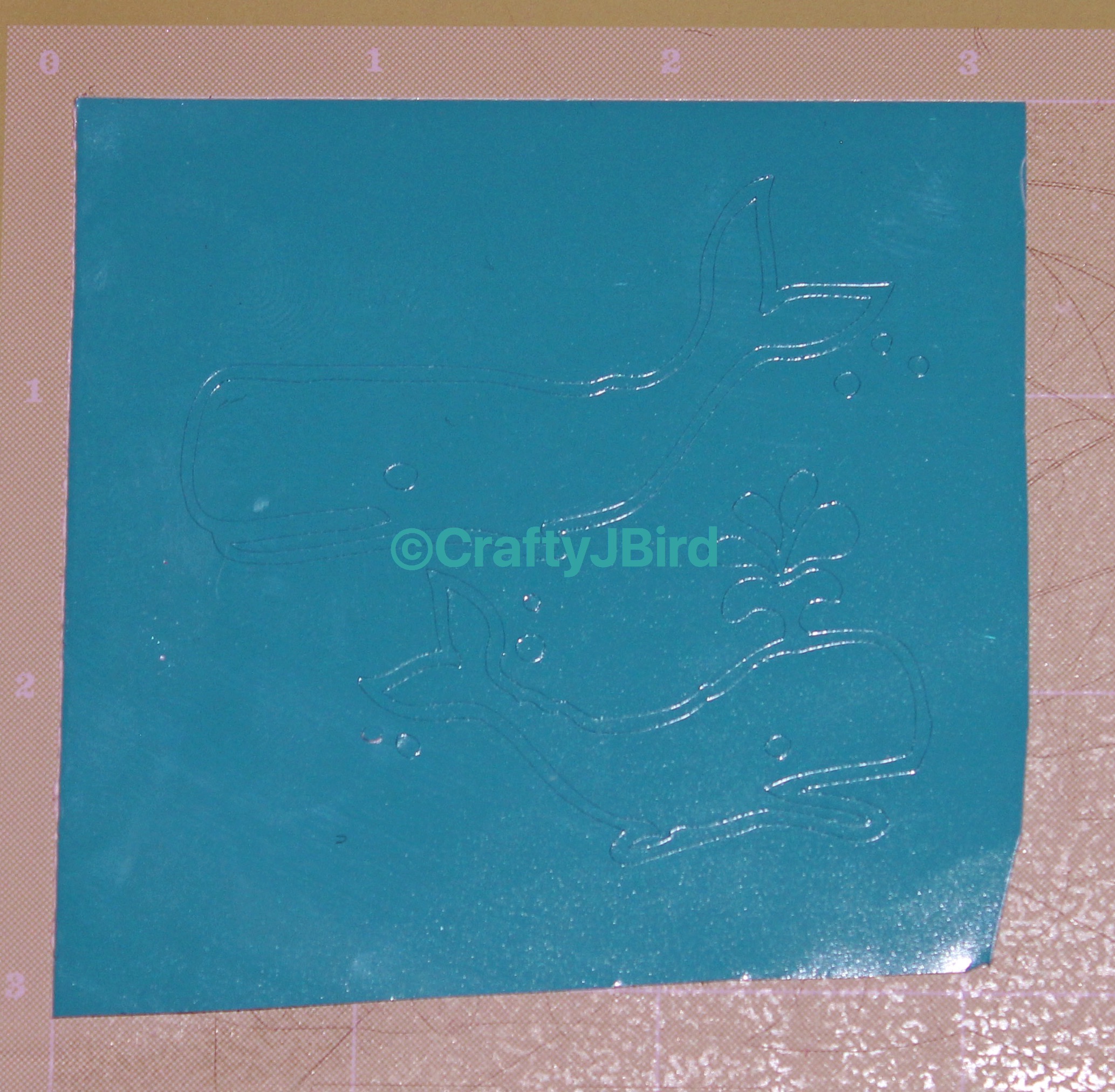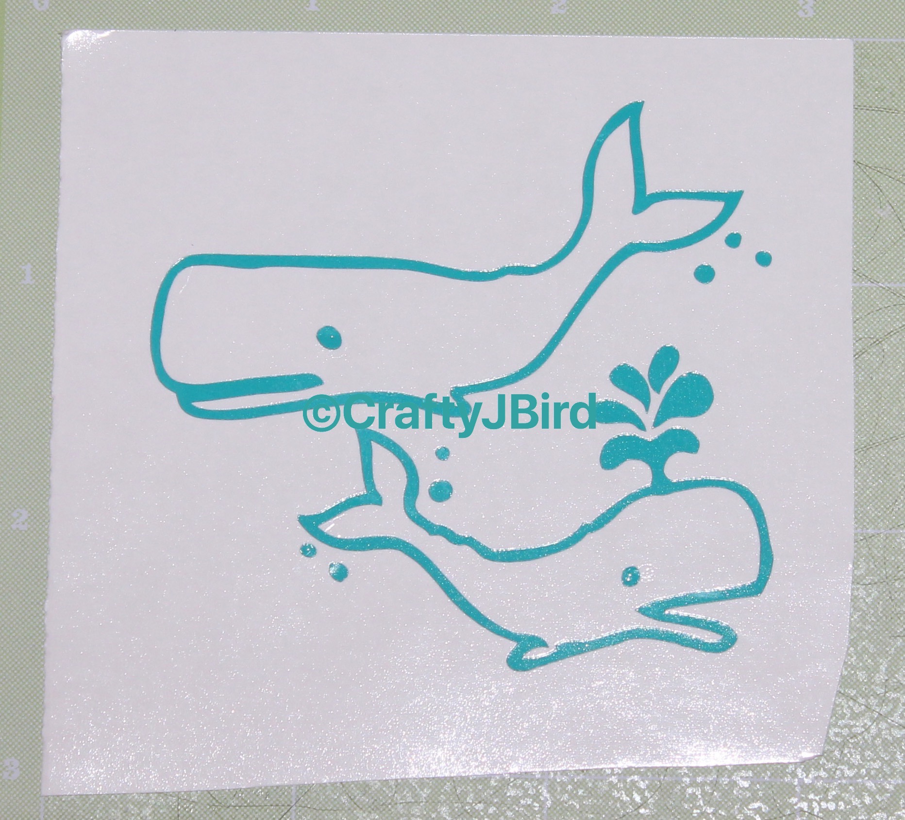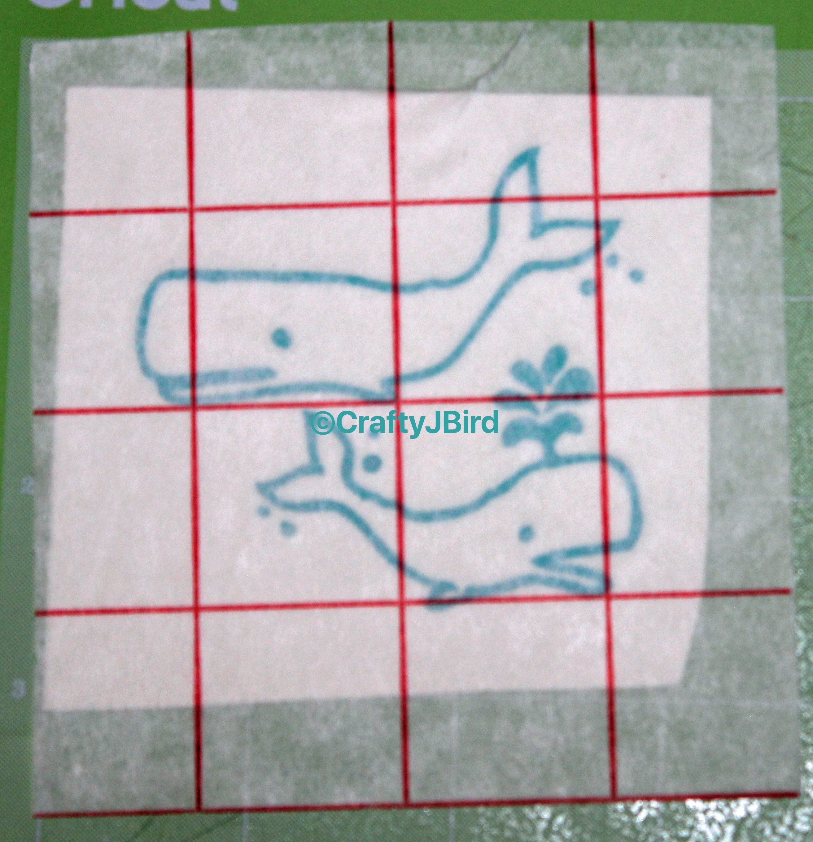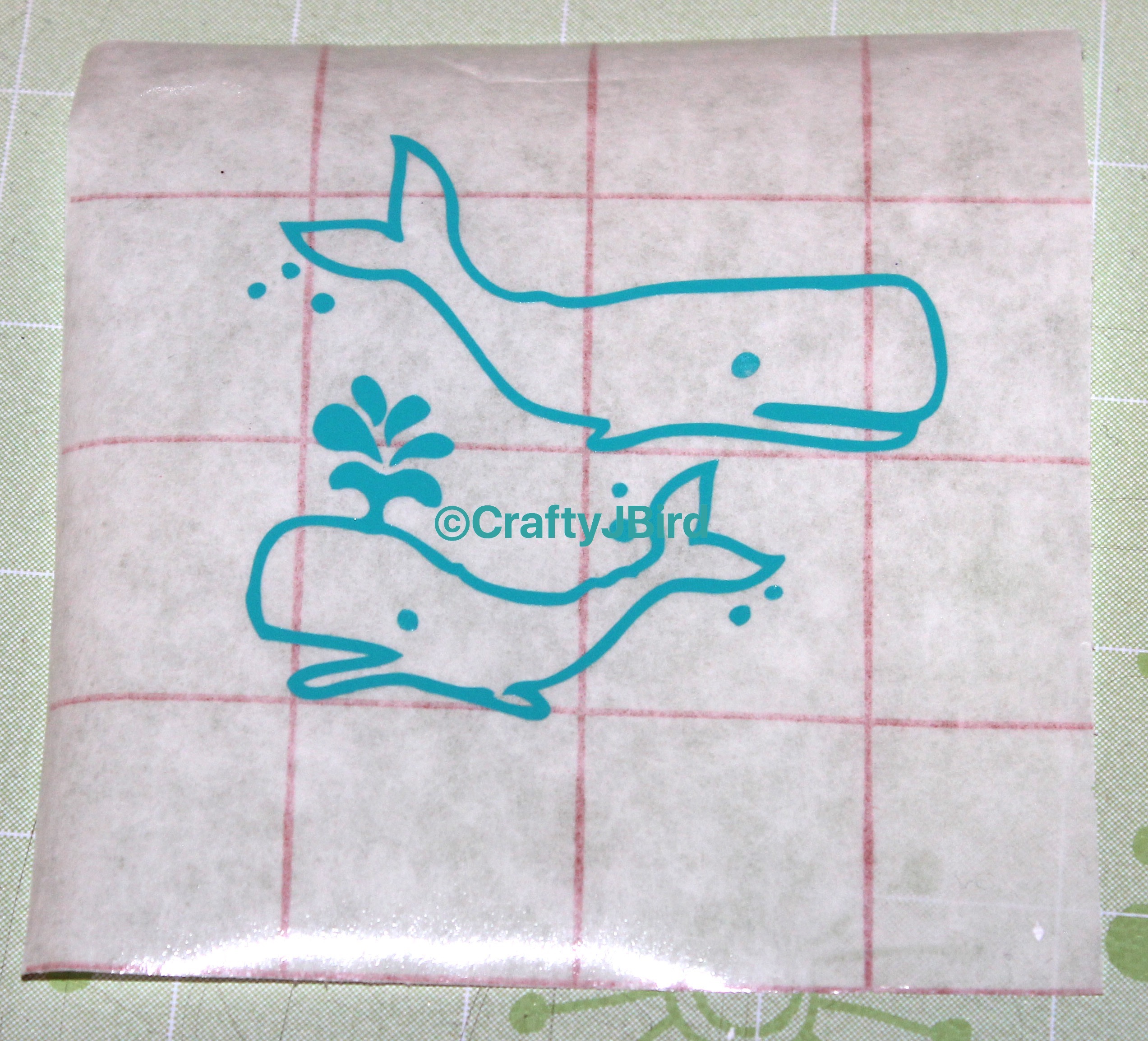 Once everything is settled and decided on size, I placed my vinyl on my Mat. I made sure to place the vinyl with the liner side down, or rather just right side up with the color showing. When I was ready to cut, I made sure I had the setting on the machine set to Vinyl. Click here for a video of my whales being cut out.