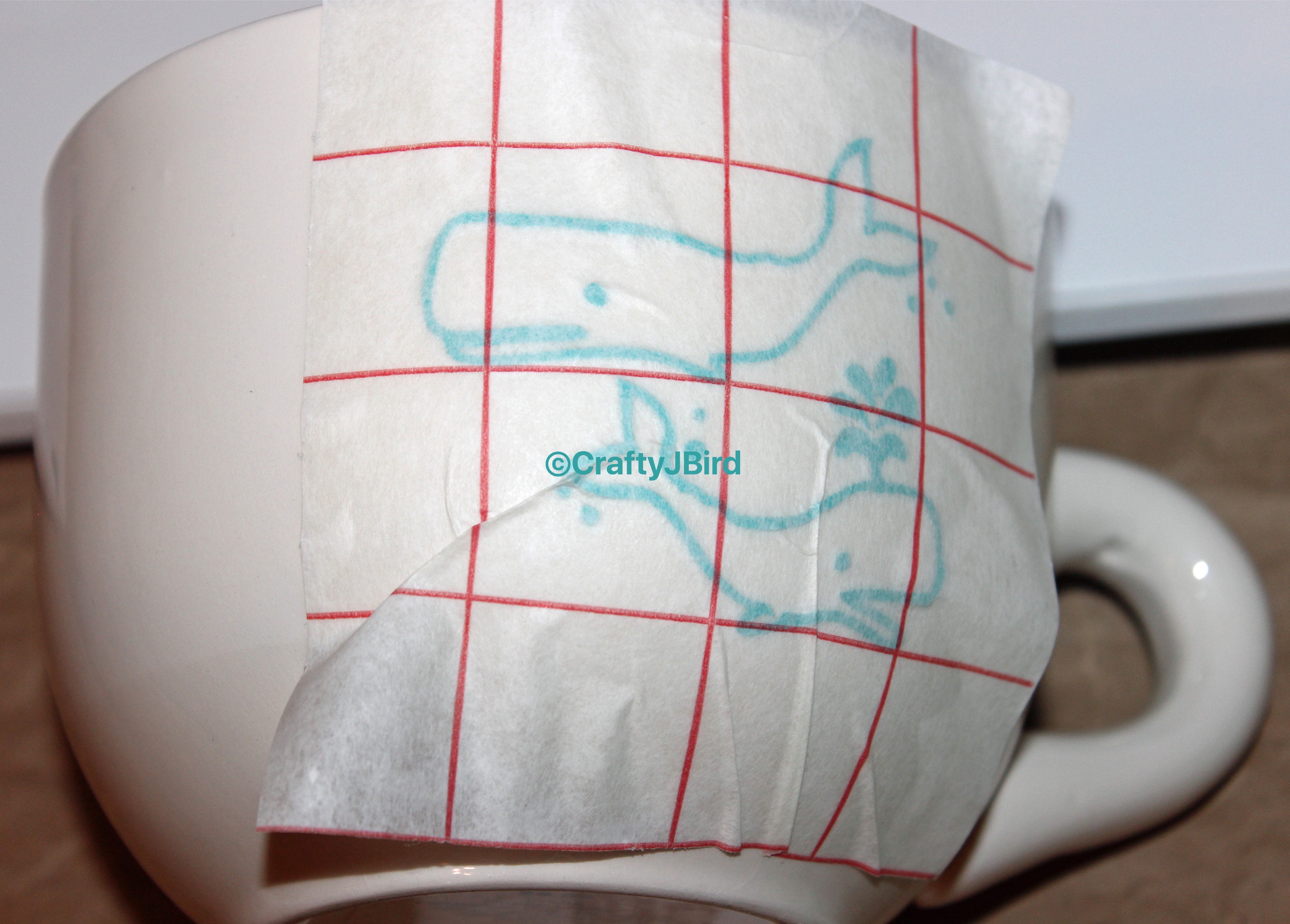 Finally, I was ready to place my whales on to my mug. Carefully, I applied everything to my mug. Then, very carefully peeled back my transfer paper making sure the whales stayed in place.
