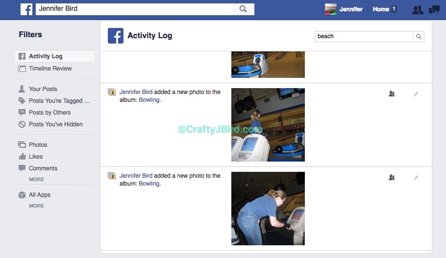 Once you click on it, you can search by scrolling down or if you know what a key word is for what you are looking for you can type it in the search box. This search function is not available on the iPad or iPhone 6 Plus. However, it definitely comes in handy when you are trying to quickly look for something particular. **Side note — I had beach in the search box but end up scrolling all the way down instead to show how far it went, these pics are actually the first pics I added to FB back in 2006.**