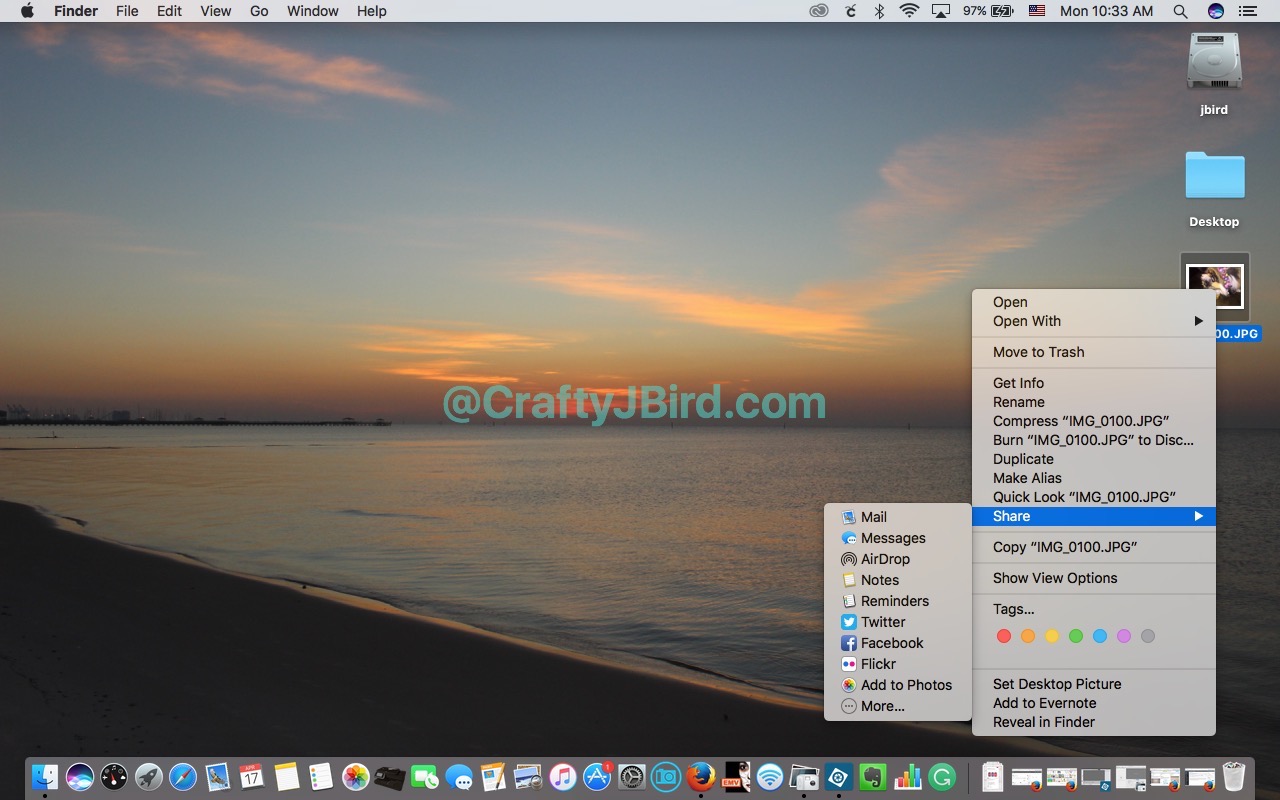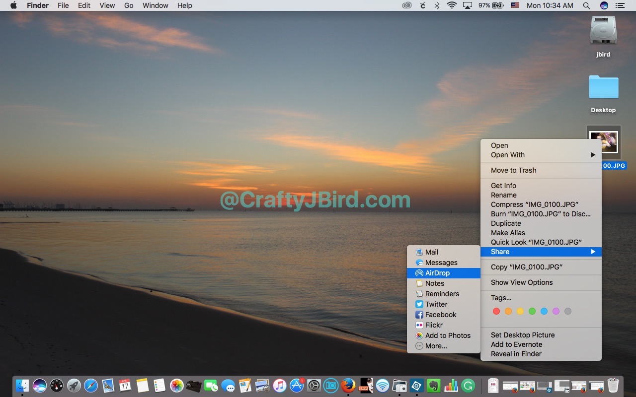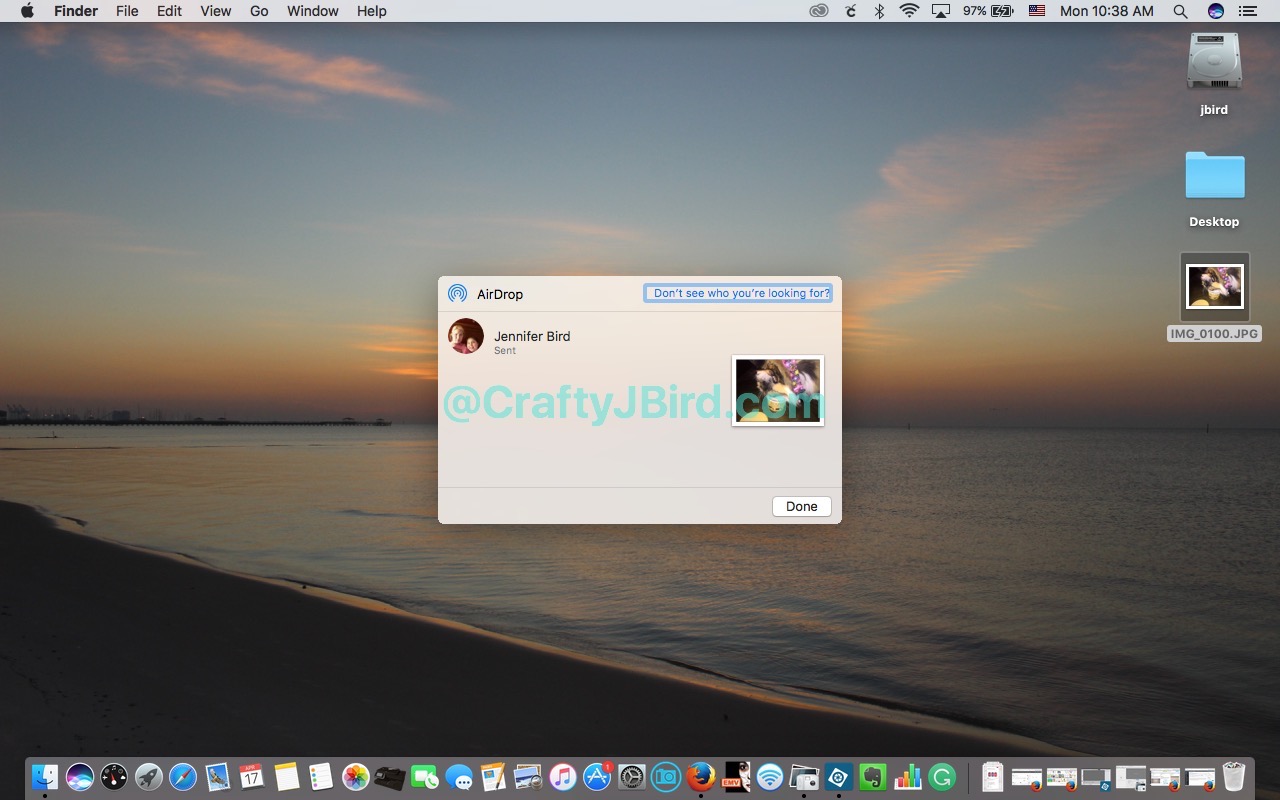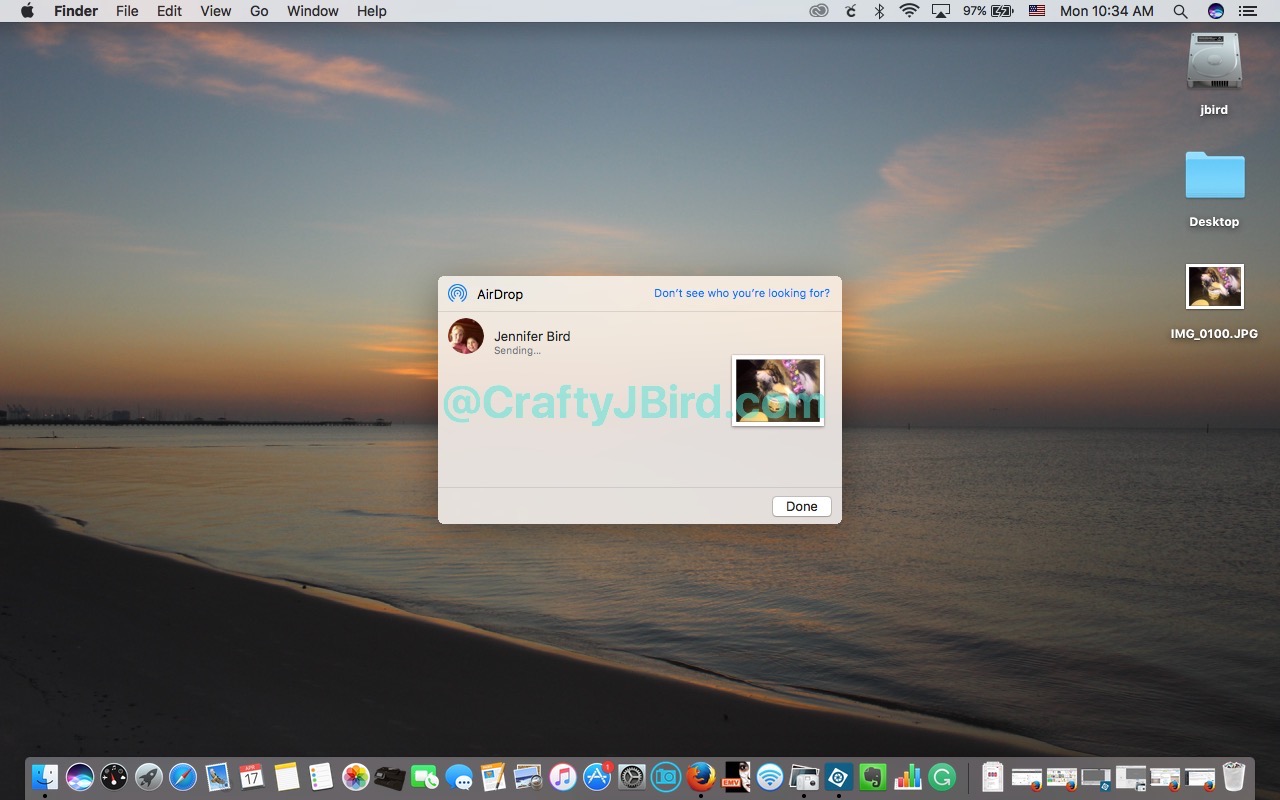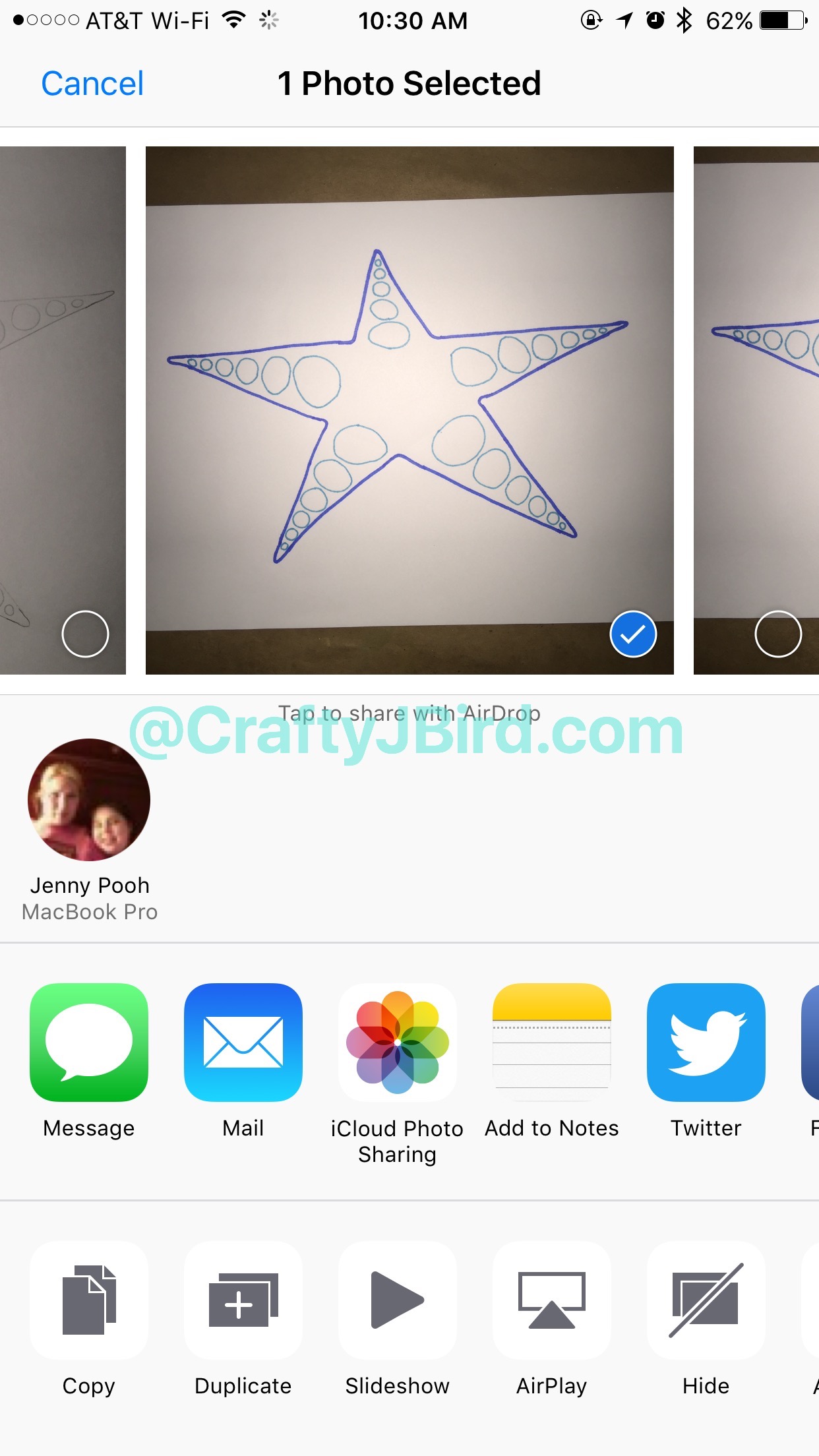 A menu will then pop-up at the bottom of the screen with various options. The first line shows the option of using “Apple AirDrop” and will show who and what device is available. Here, I, of course, wanted to send the picture to my computer. So, I selected where it says “Jenny Pooh MacBook Pro.”