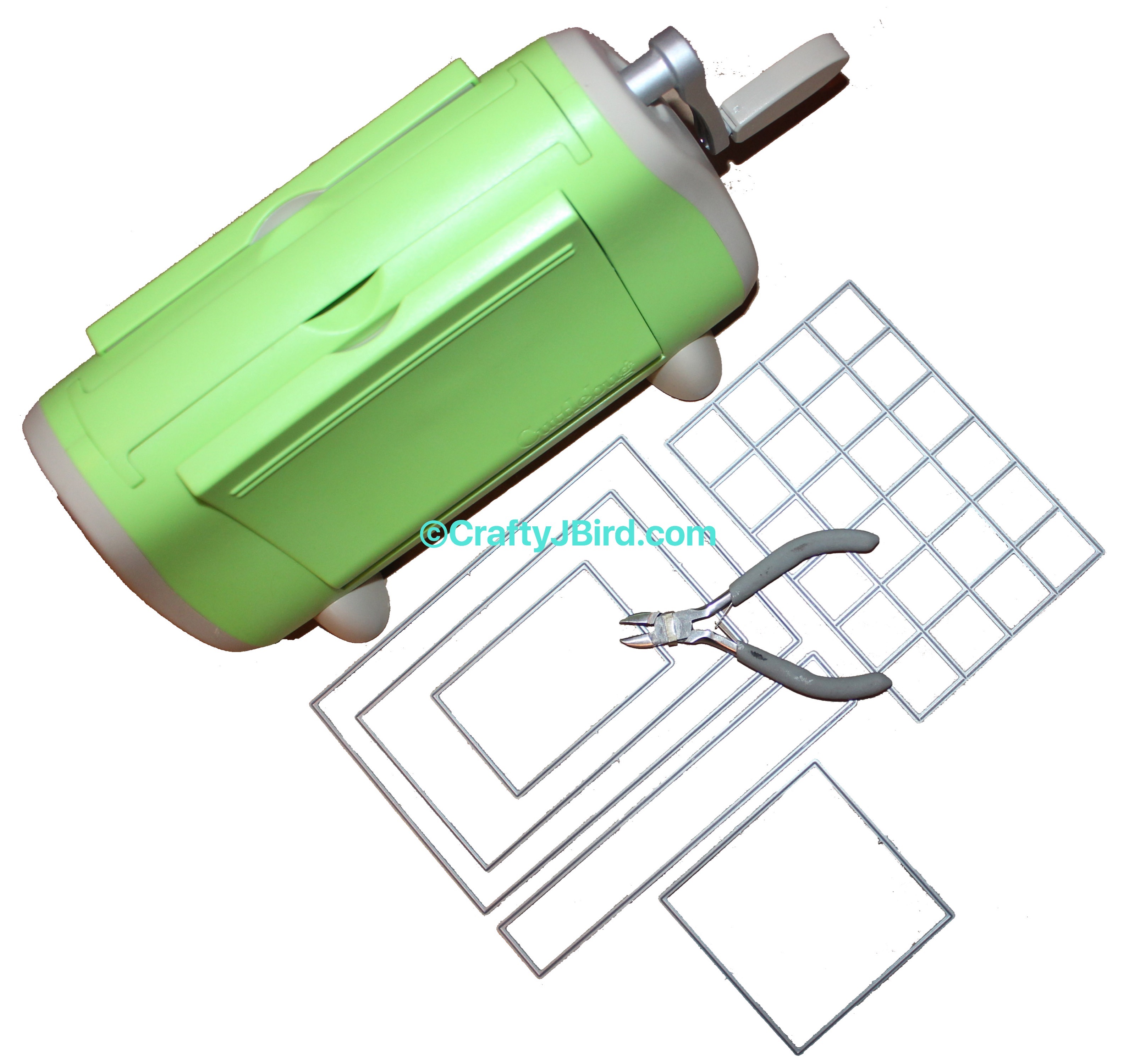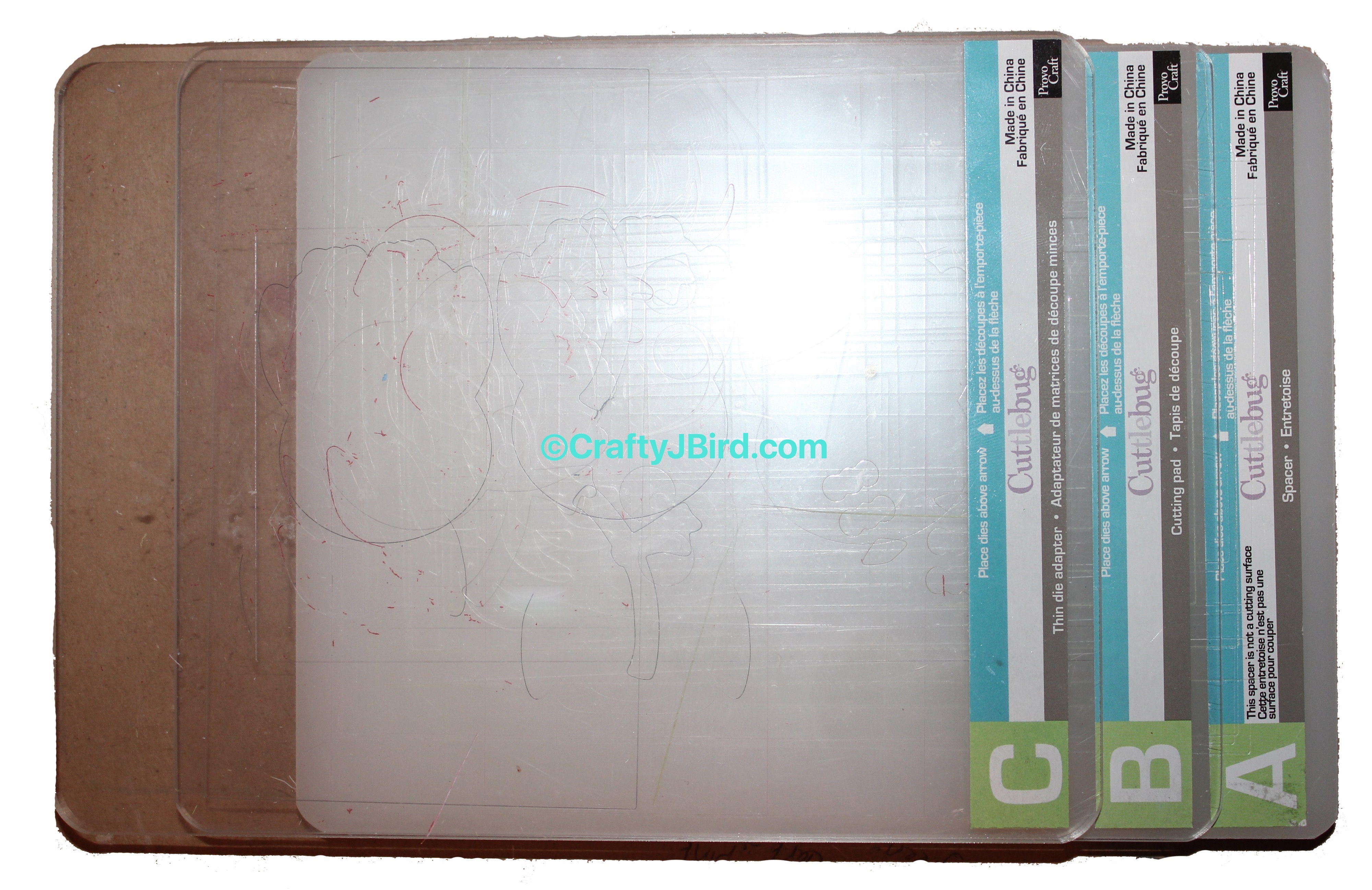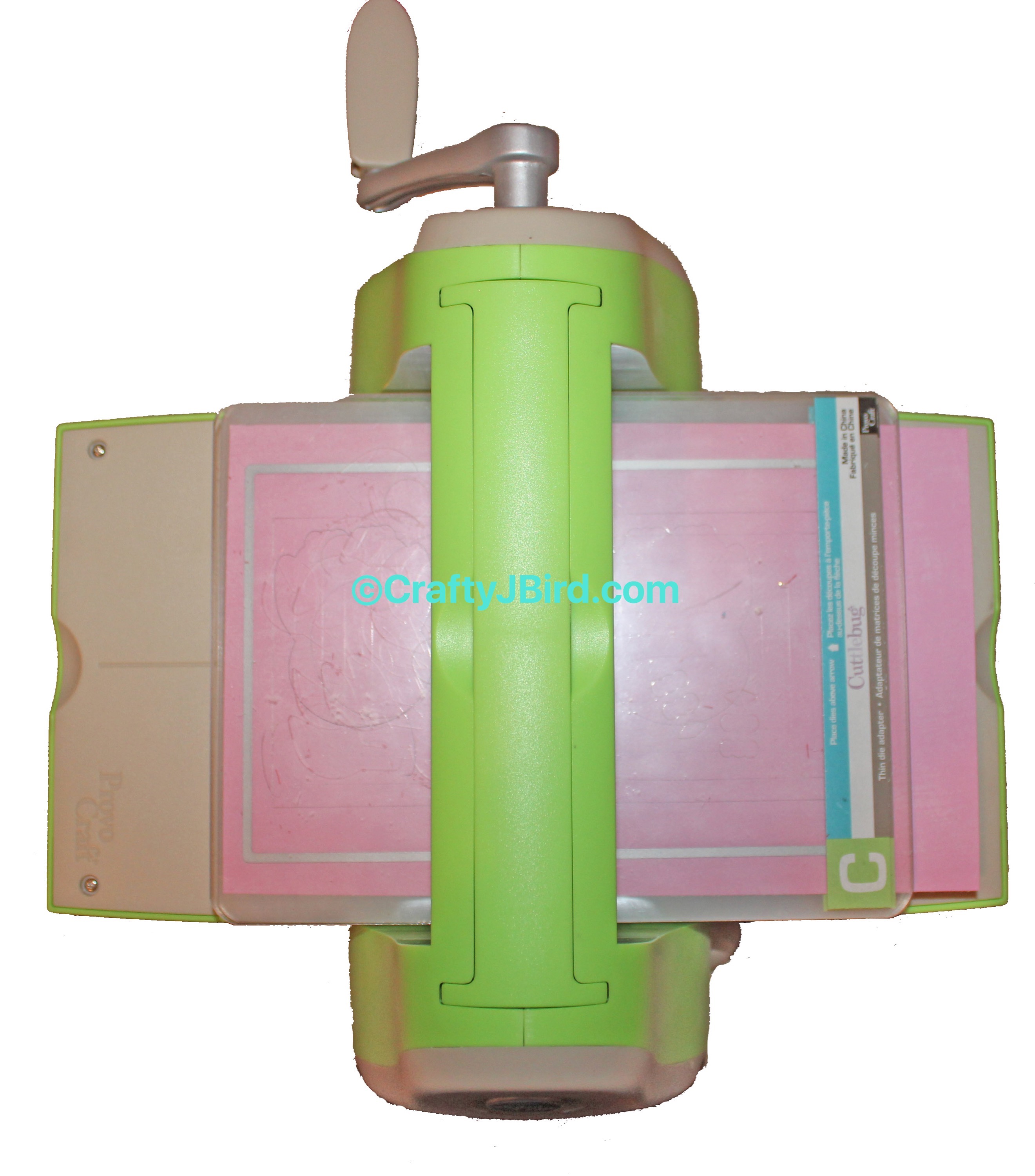 When using the die cuts make sure the flat side is facing up. Also, if you are cutting in the same color different sizes, there’s a chance the die cuts will all fit like it did when I cut the green pieces out. To cut the pieces out I used the Cuttlebug’s three pieces, ‘A’ where I put the paper directly on it; ‘B’ on top of the paper and die cut; and ‘C’ to fill the extra space since the paper I used was fairly thin.