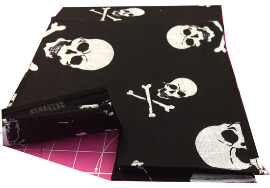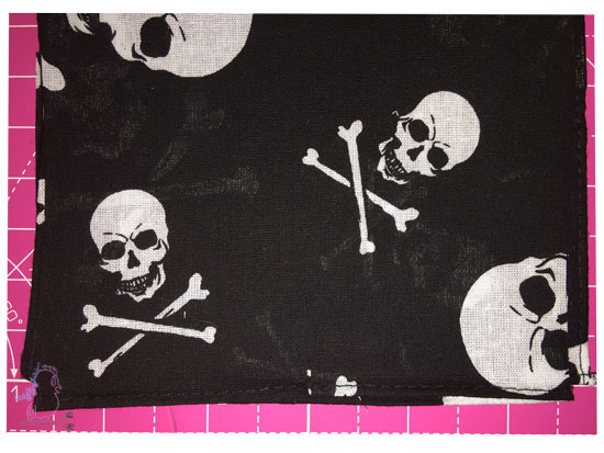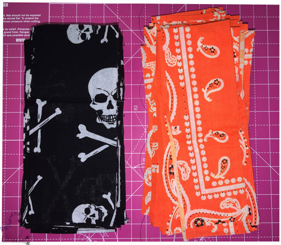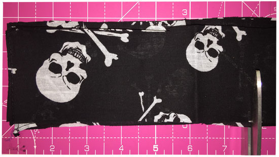 The first thing I did was lay a bandana out on my cutting mat and measured out 2.5 inches making a cutting mark at each mark. Once finished, I went back and cut all the way across for the length of the bandana on the middle cut where I then had two pieces.