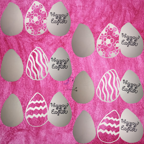 For the top three egg sets, I slanted them slightly but made sure to do the math for the opposite side making sure they still matched up. With all the set of eggs matched up accordingly, I used the ‘welding’ feature for each one. If you remember a couple weeks ago when I made my “Hearts of Luck St. Patricks Day Card,” I simply used the ‘attach’ feature, which worked just fine but I thought I would play around with the ‘welding’ this time.