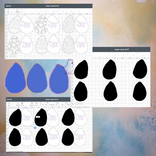 Once I had the background outlines uploaded to Cricut Design Space, I added them as well as the rest of my “Easter Egg Drawing.” After playing around, I finally got them they way I wanted, making each set of eggs rougly 5.5 in height and 7.4 in width. I put the eggs with the cutouts on the left and added their matching outlined eggs with the backgrounds on the right but also flipped them horizontally so when I went to fold them they would match up correctly.