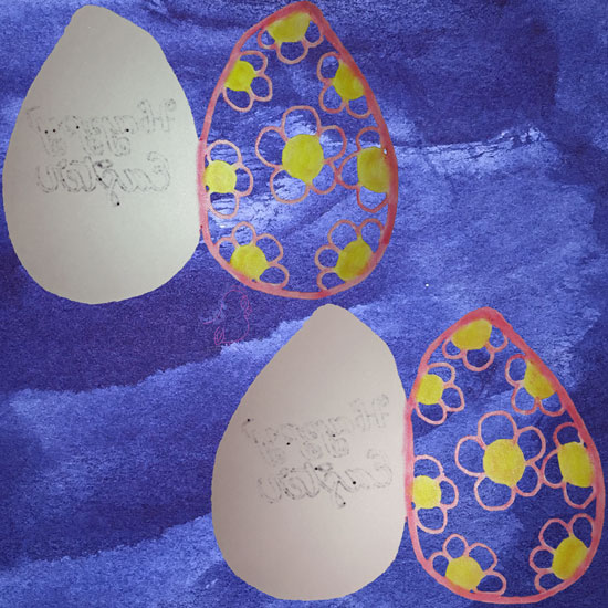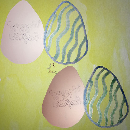 Here, you can see all the cutouts and the writting of the “Happy Easter” saying. For the writing I used the “Tuxedo Black” BIC Mark-It Ultra Fine Point Marker. The solid egg cutouts to the left of each set of eggs if the vellum cutouts.