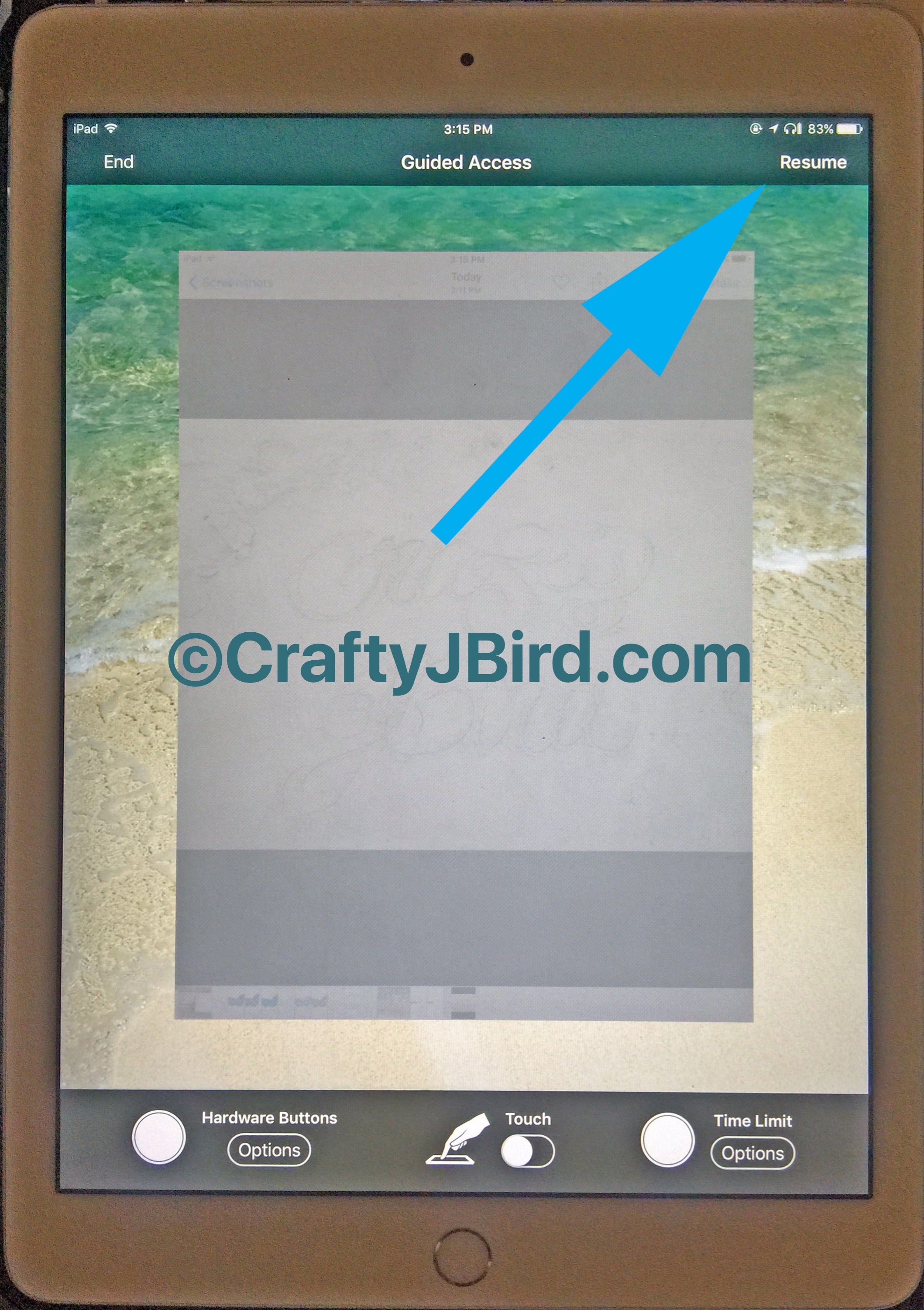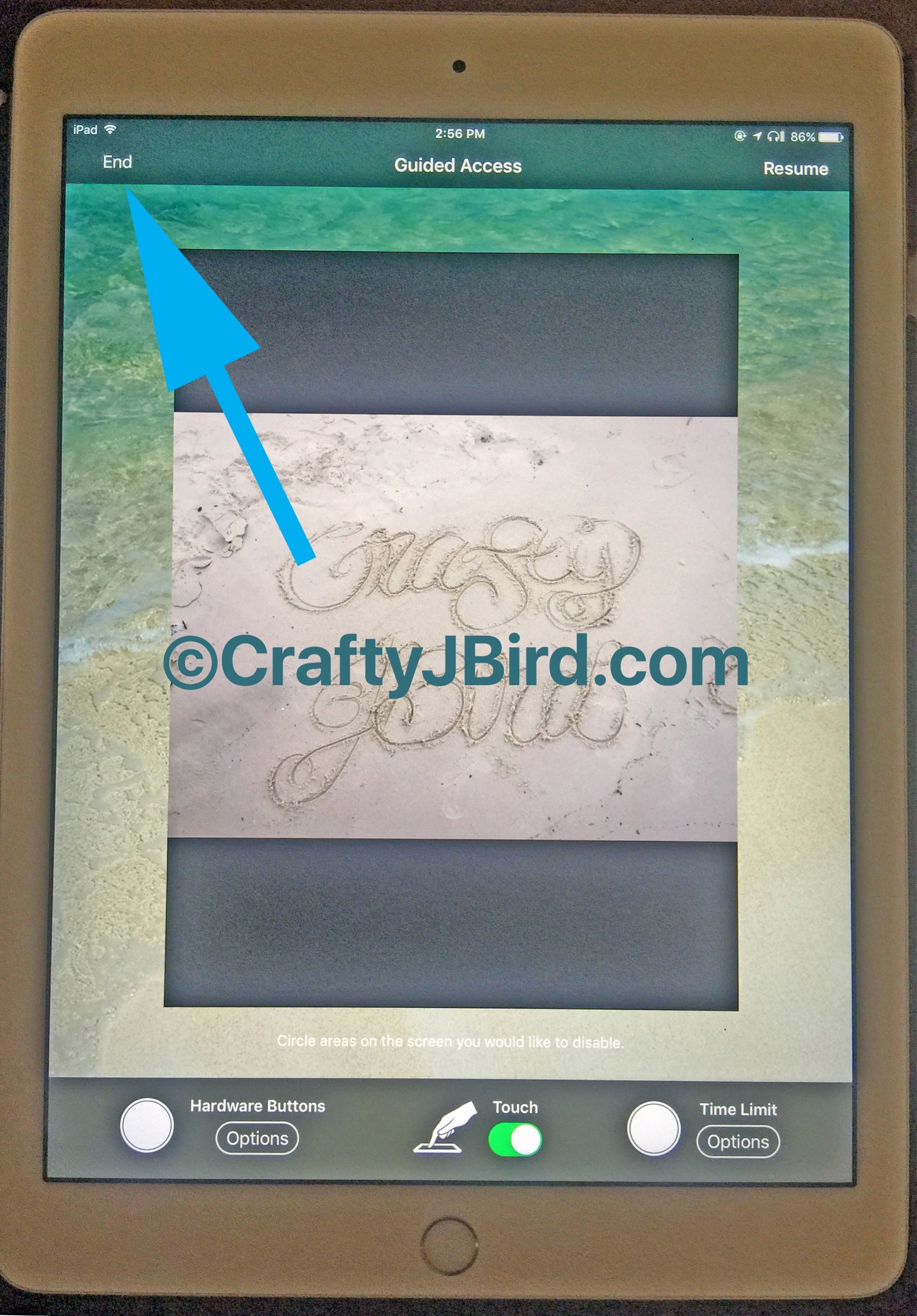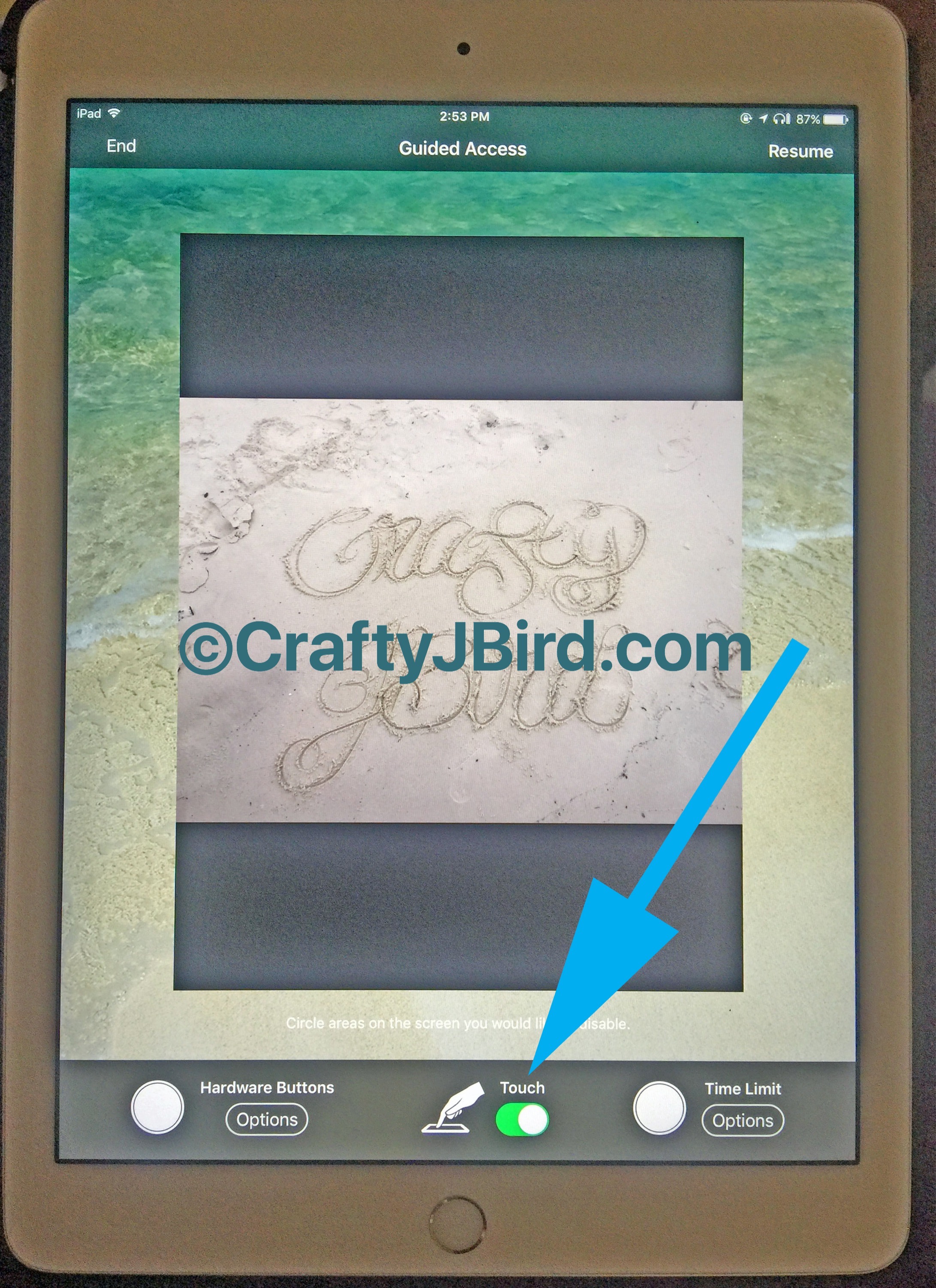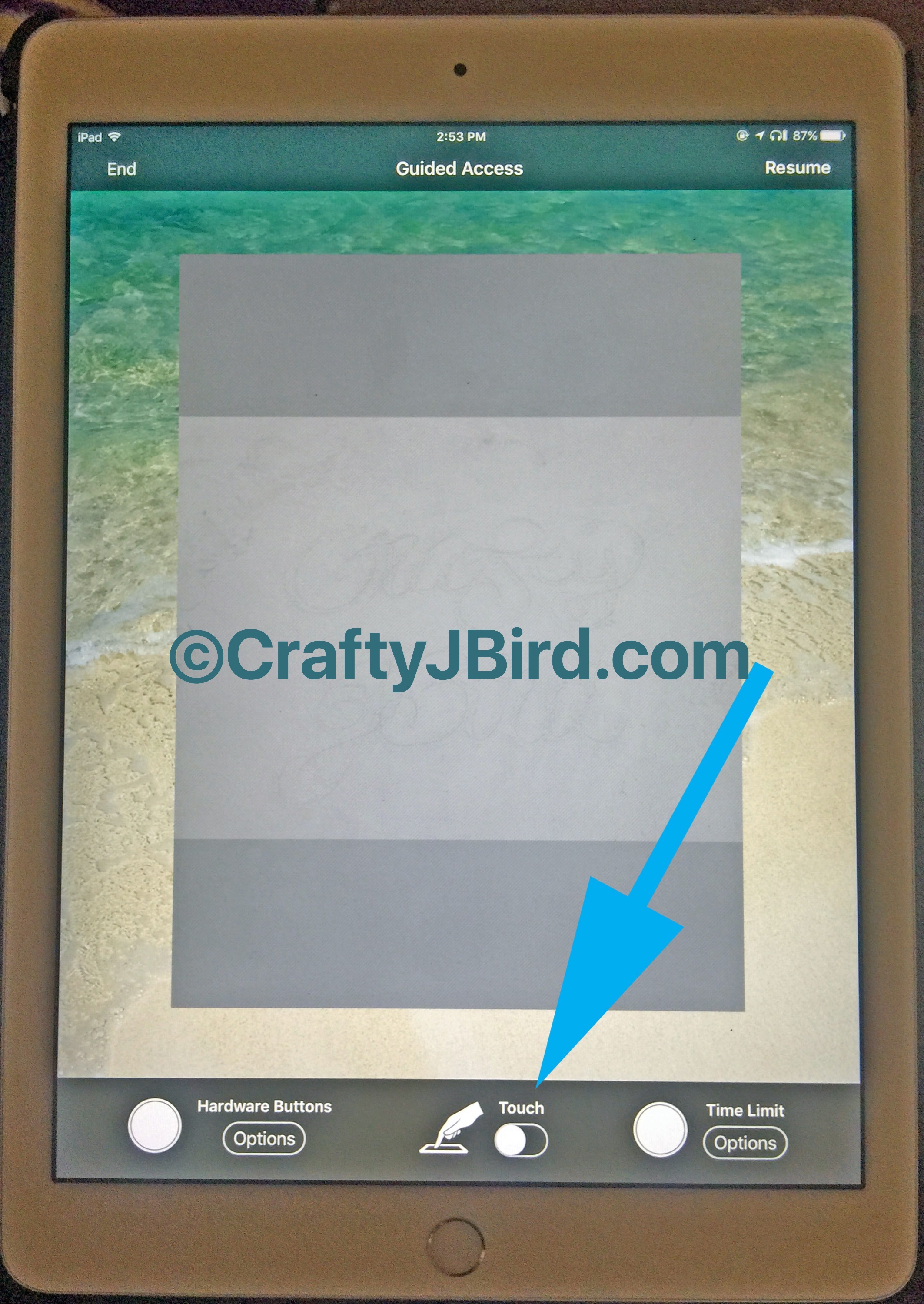 To have your iPad Traceability, you will want the ‘touch’ mode ‘off.’ No fear, this will cause a fog-like overlay on your photo, this is normal. Once in ‘off’ mode, you will want to click on the button in the upper right-hand corner. On mine, because I’ve had it set up for a while now, says “resume;” however, for those setting it up for the first time it will say “start.” Also, for those setting up the Guided Access up for the first time, if you have it on Passcode mode too it will prompt you to create the Passcode at this point.