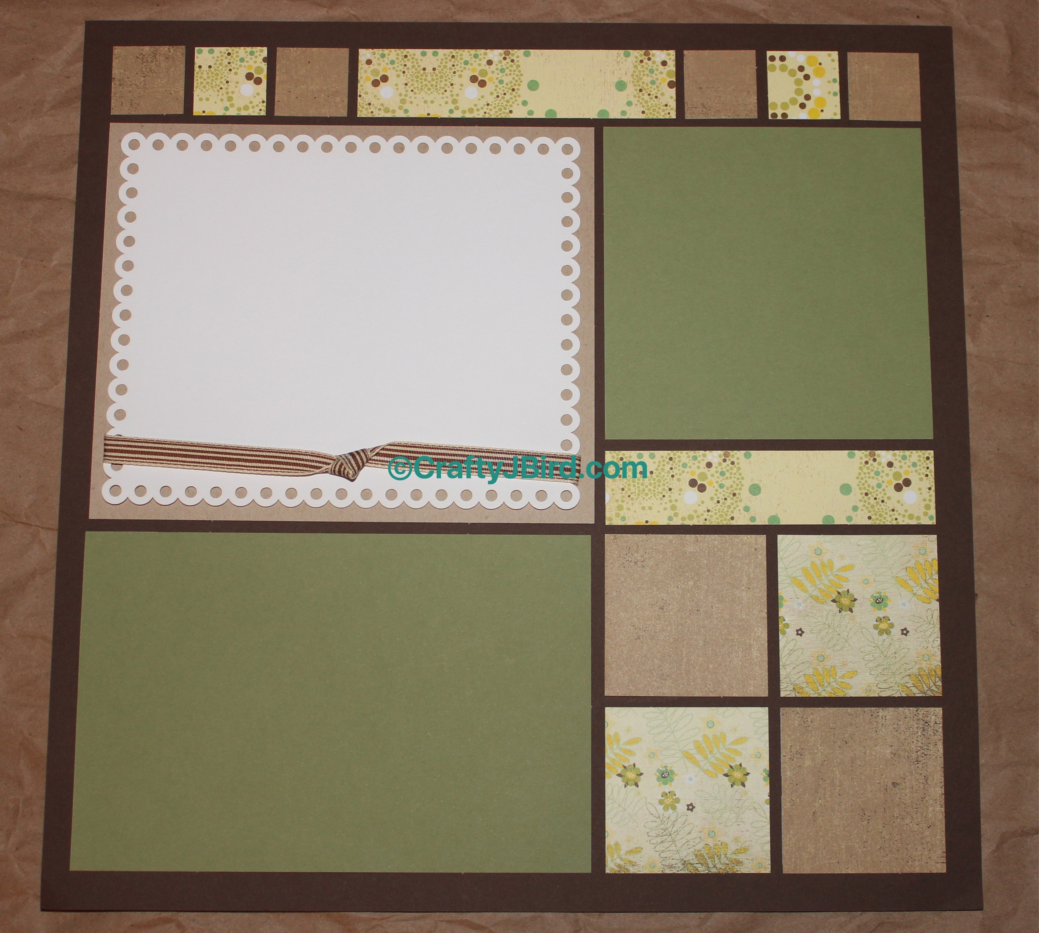 So the blank spot above is this photo mat with the ribbon. Basically all you do, if you’re new at this, is tie a knot to one side of the piece of ribbon. Once you’ve got your knot you just use your adhesive and attache the ends of the ribbon to the back of the white piece of matting in this case. Again, if you’re new at this, ribbon just adds a little more if you don’t want to add anything else; which is perfect since ribbon can be super cute and cheap.