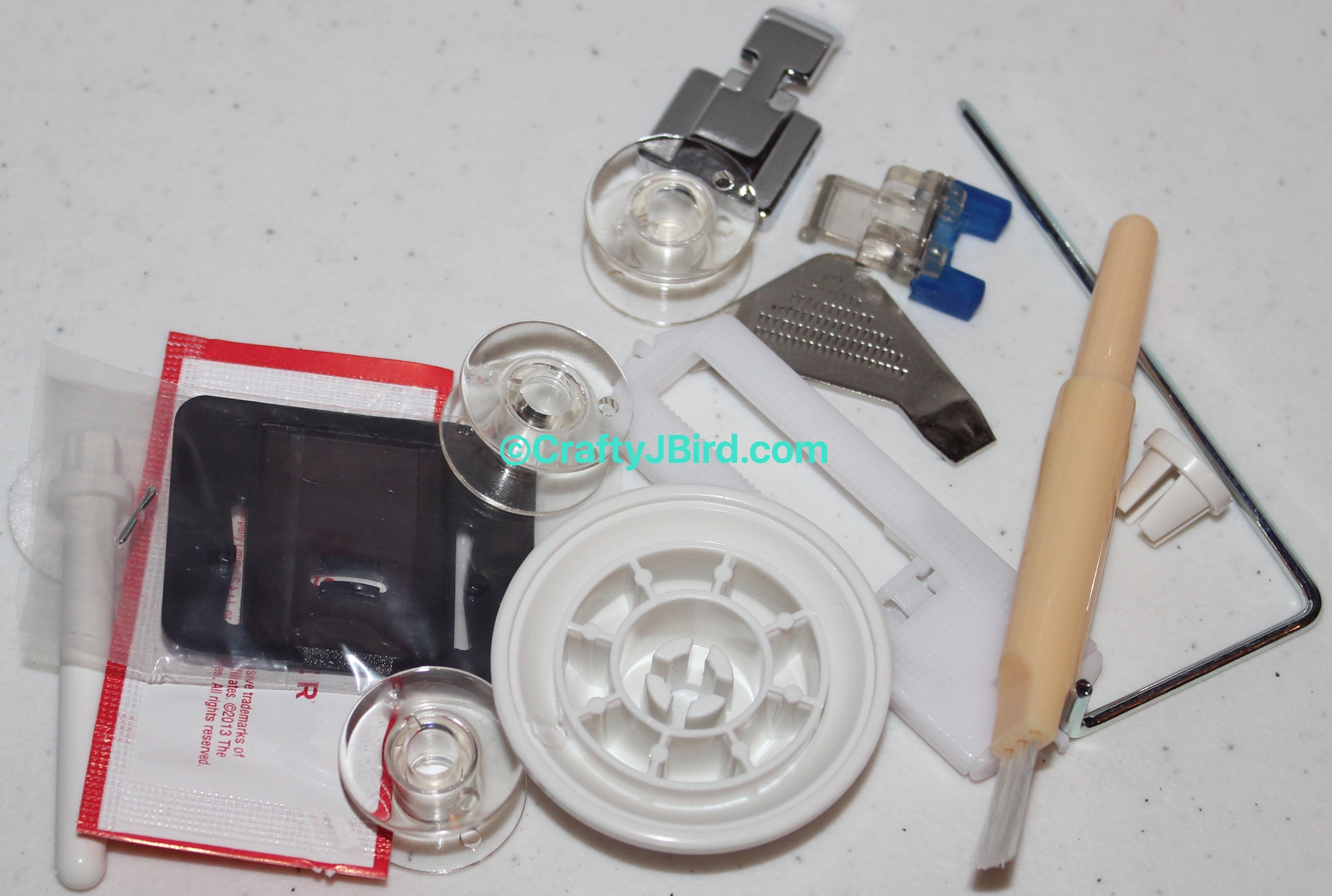 Learn To Sew Again -- Visit CraftyJBird.com for more info... First, here’s an overview of what all comes with this particular sewing machine. In this pile, you can see the machine comes with: