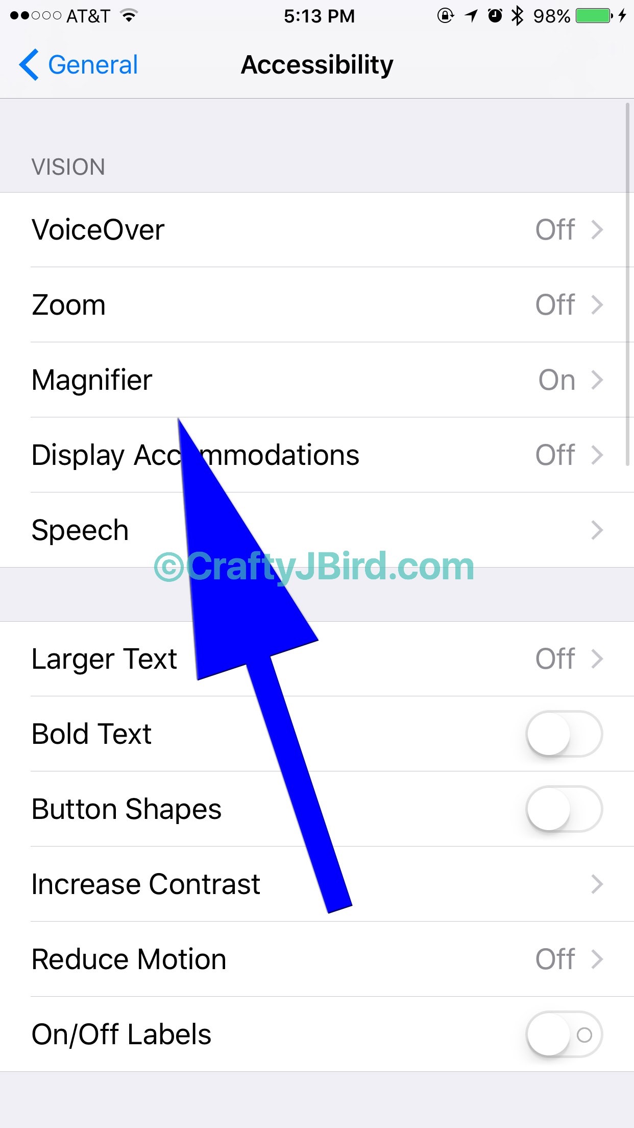 Click on Magnifier and slide the slider to the right where it shows green on the left. You can also set the Auto-Brightness to ‘on’ but personally, I’ve never used it.