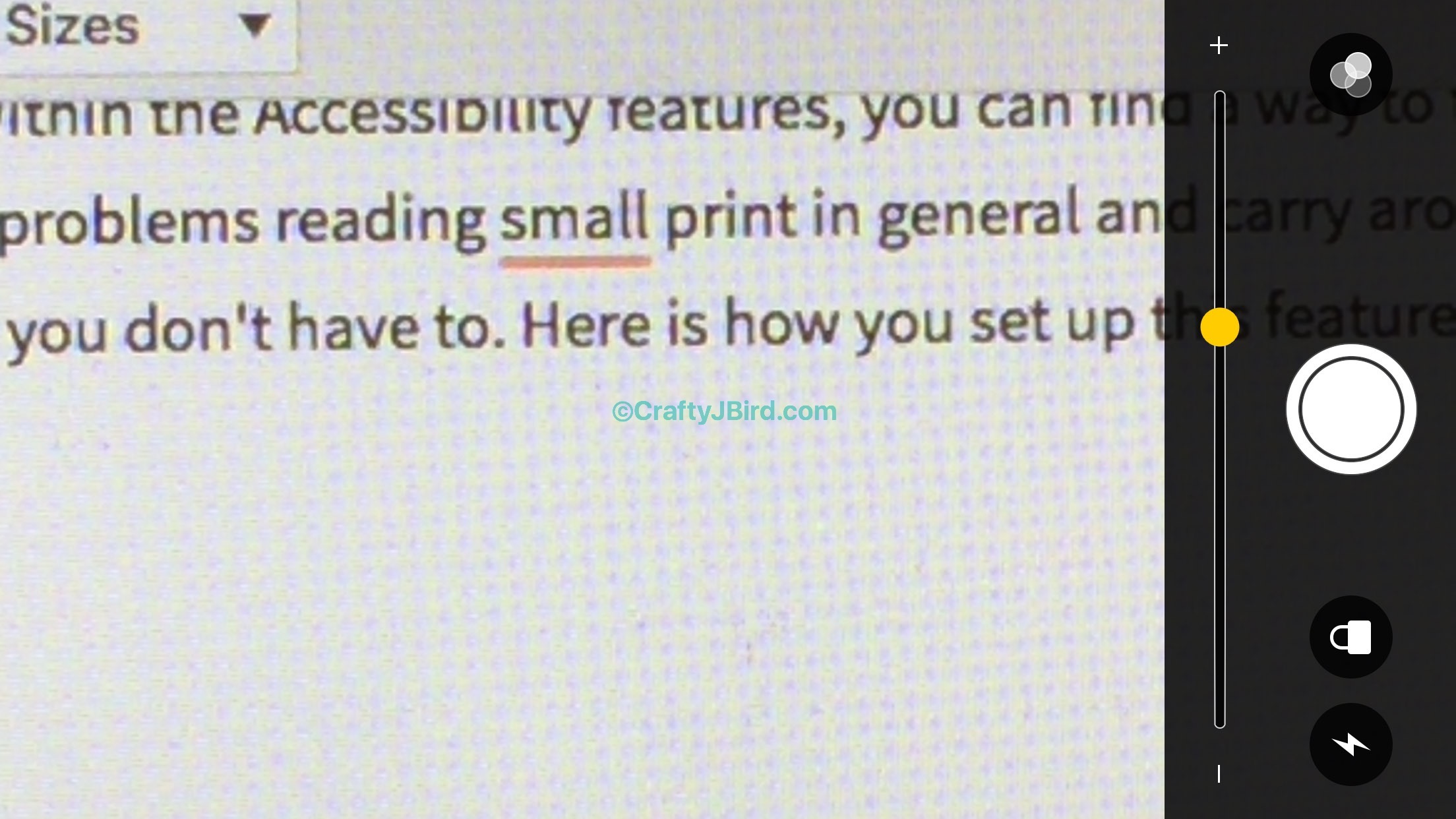 Once back on the home screen, triple-click your home button quickly and it will bring you to a screen that is similar to the camera. After to the Magnifier feature, you can move the yellow slider accordingly. All the way to the right makes whatever you want to magnify bigger, all the way to the left makes it smaller.
