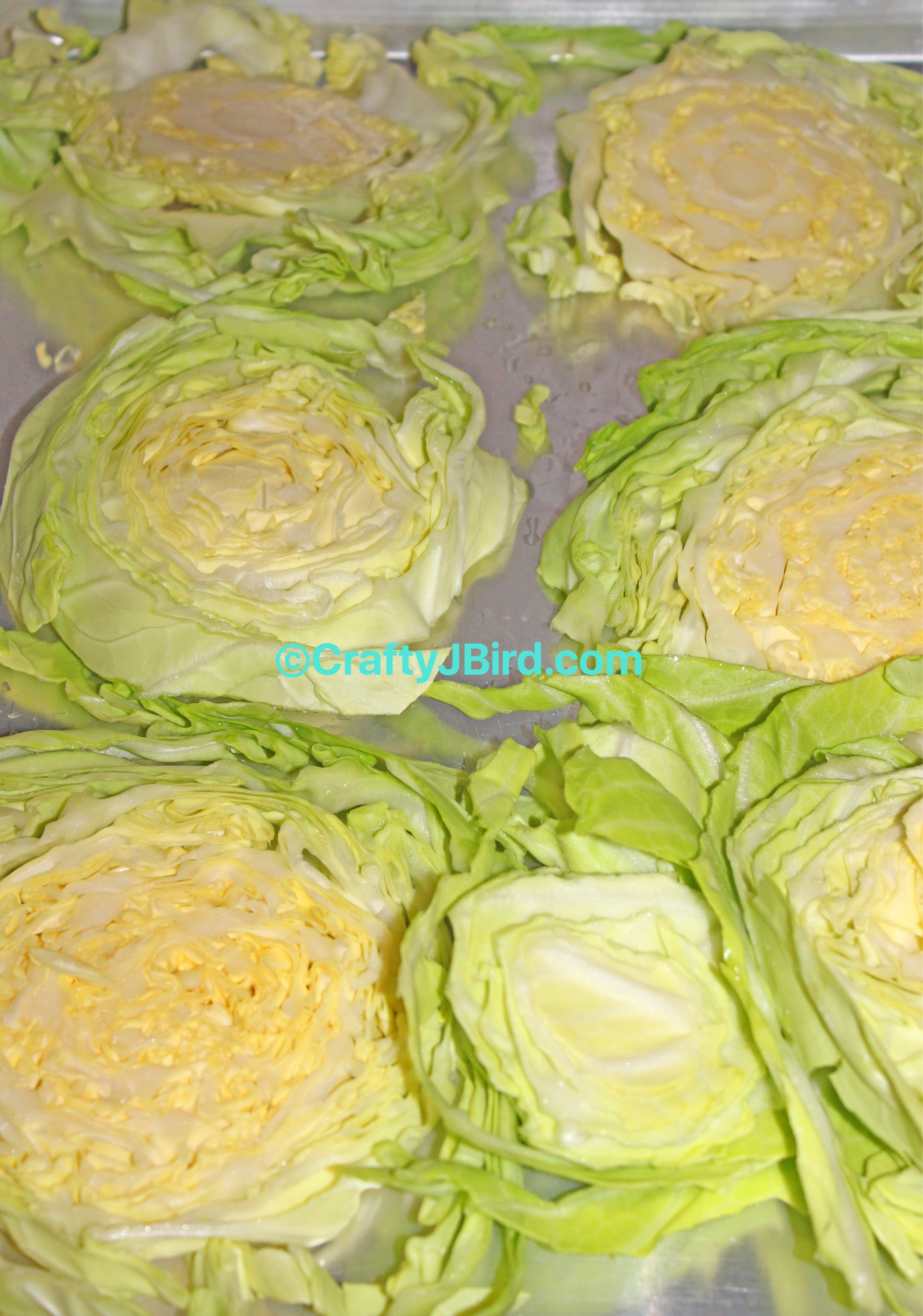 First thing I did, was set my oven to 425* so it could go ahead and get heated while I got everything else ready. Then, I washed my head of cabbage and cut it in slices. Most recipes I’ve read say to cut in 1-inch slices but I just kinda cut where I want.