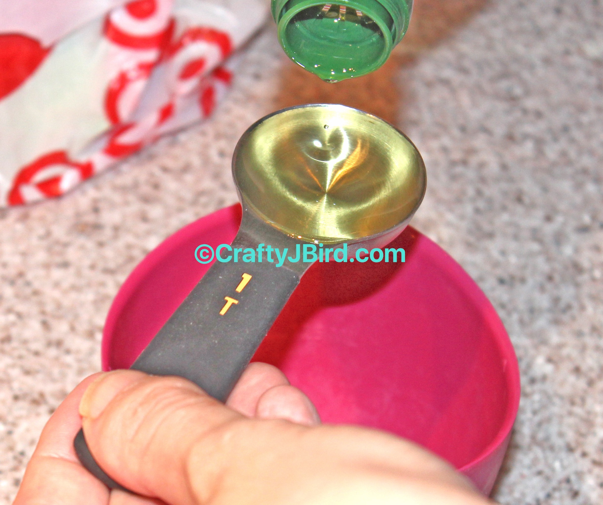 Once I have all my pieces cut and on my cookie sheet, I get my Olive Oil mixture ready. Since I didn’t have quite enough the first time I attempted making these, I used about 5 tablespoons worth of Olive Oil and added it to my prep cup.