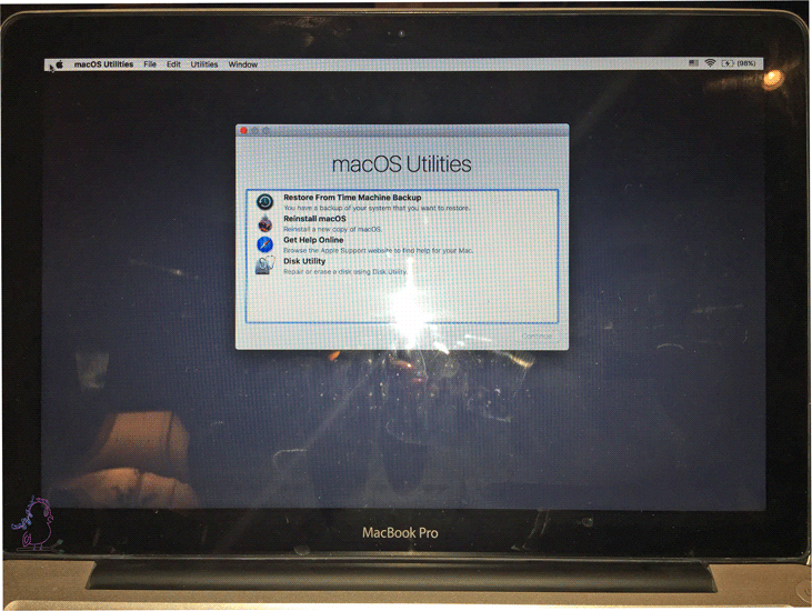 After everything is finished backup as you want, you will restart your computer and as soon as it starts restarting (black screen) press and hold down Command + R until you see a screen like the one you see here with macOS Utilities.