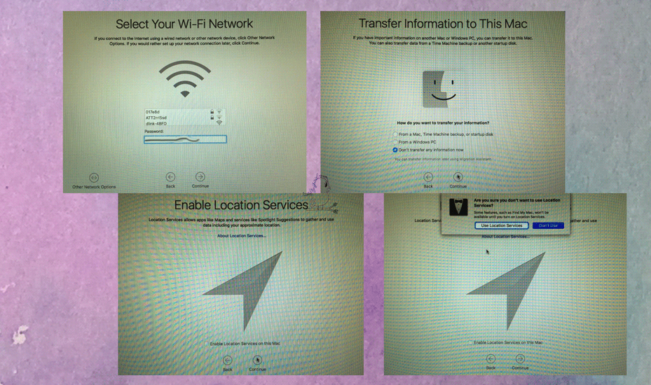 Next, you will select and connect to your Wi-Fi to finish setting up the computer. Here, you also will be asked to Enable Location Services. You can opt out but doing so will not enable the Find my Computer option.