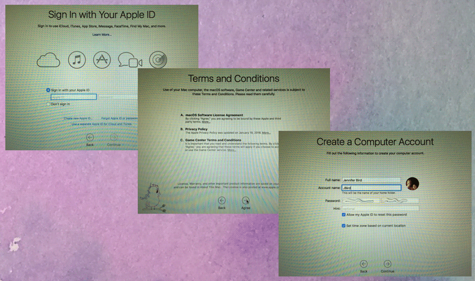 Once you’ve signed with your Apple ID or if you chose, created a new one; you will be asked to Agree to the Terms and Conditions. After agreeing you will then Create a Computer Account. Personally, I like to have where I have to log in to my computer each time I go to use it. This ensures, for example; if I decide not to take it with me one day while staying in a hotel, the maid or something cannot access my computer while I am gone.