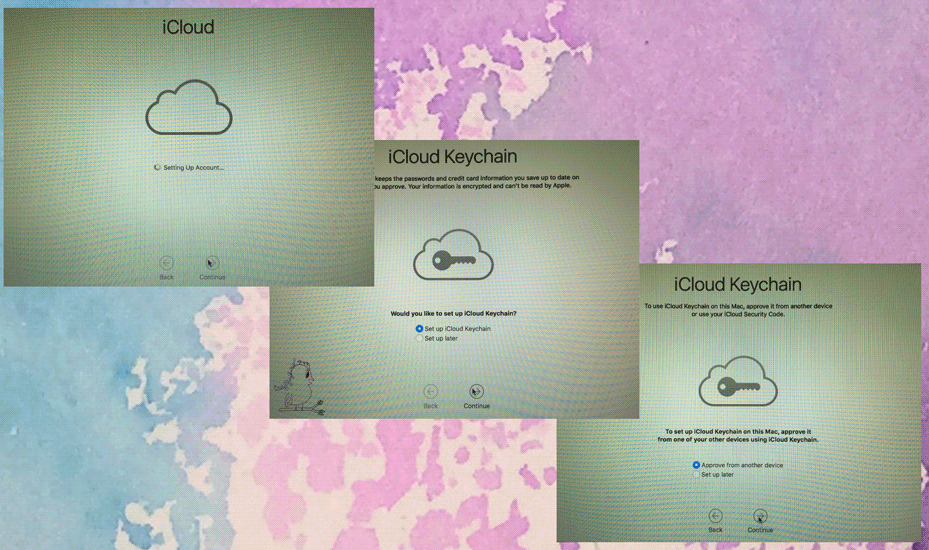 Then, you will see the screen where the iCloud is getting set up on your computer. Once iCloud is finished, you have the option of either setting up iCloud Keychain – AKA logins and passwords or waiting until later if you chose to set it up at all. If you decide to go ahead and set it up you will then be asked if you would like to have it approved by using another device also using your Keychain.