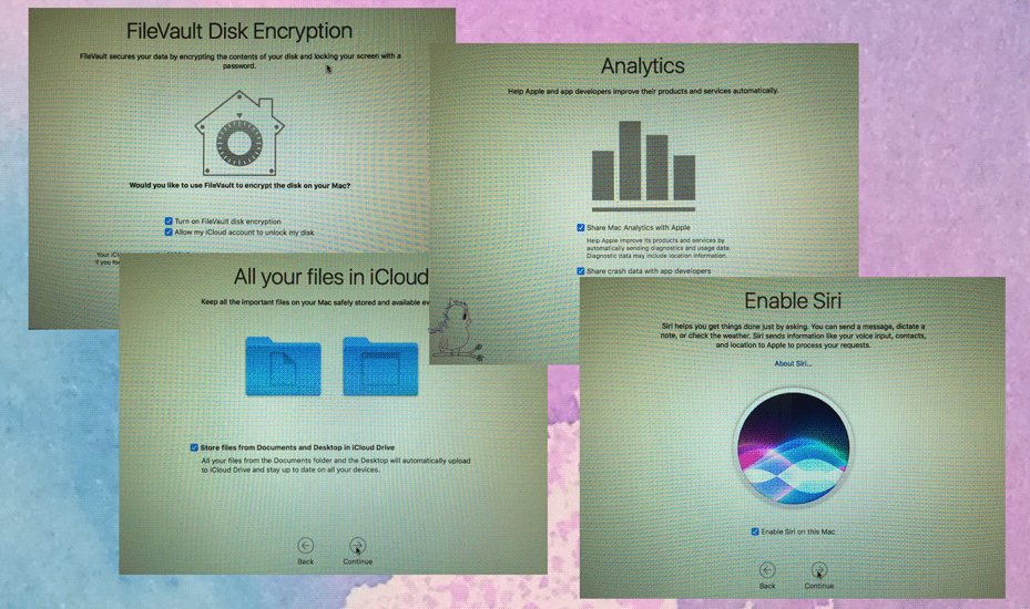 With your iCloud account is finished setting up will have the next four screens come up. It will ask about the FileVault Disk Encryption, Keeping your documents in iCloud, sending reports to Apple for Analyzing if something decides to crash, and finally; it will ask if you want to Enable Siri. Though I don’t particularly use Siri, I went ahead just in case one day I actually do use her.
