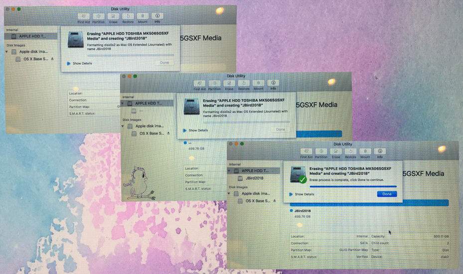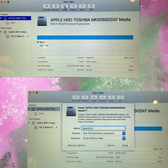 As you can see, I named mine JBird2018 so I would remember when I did a total wipeout last. Make sure in the Format drop-down Mac OS Extended (Journaled) is selected, and for the Scheme, drop-down GUID Partition Map is selected.