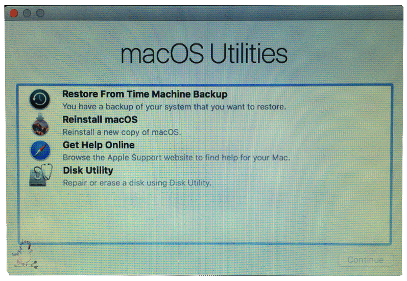 Once at the macOS Utilities screen, you will highlight Disk Utility and click continue at the bottom.