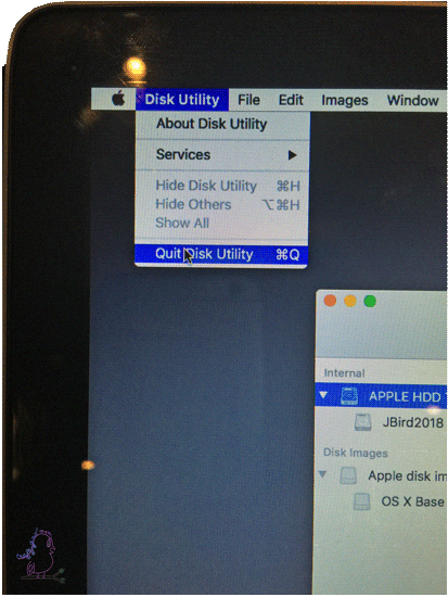 Once the computer is finished doing its thing by erasing the old and creating a new HD, you will then select the top menu for the Disk Utility to Quit to exit.