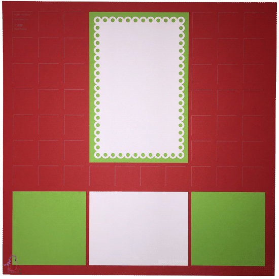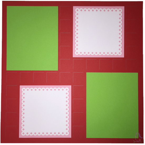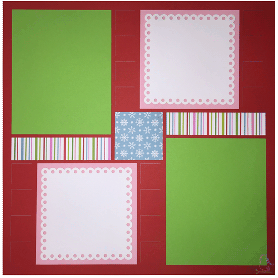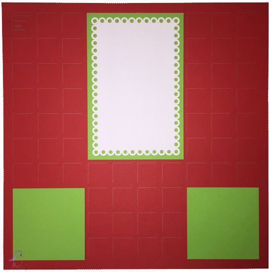 To start, I carefully attached the white scalloped white cardstock to the green cardstock on the left side of the layout. Then, I added the two pieces of green cardstock to the right side of the layout accordingly.