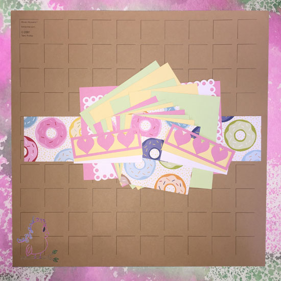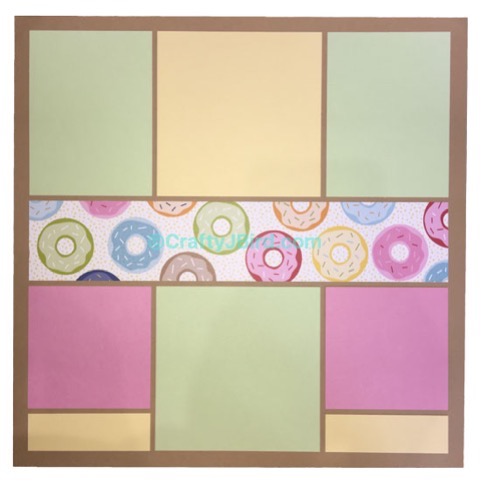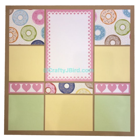With all the solid cardstock pieces in their spots on the double page layout, I added the super cute donut pieces to their places.