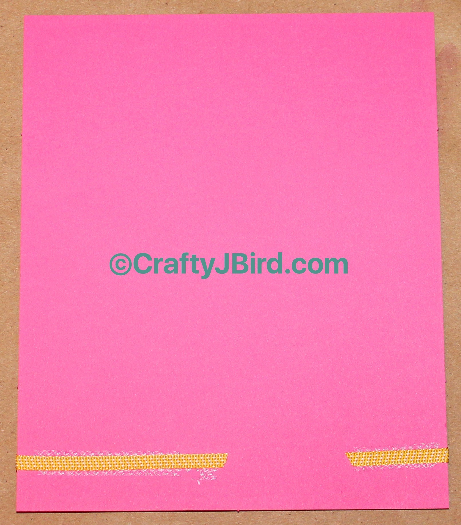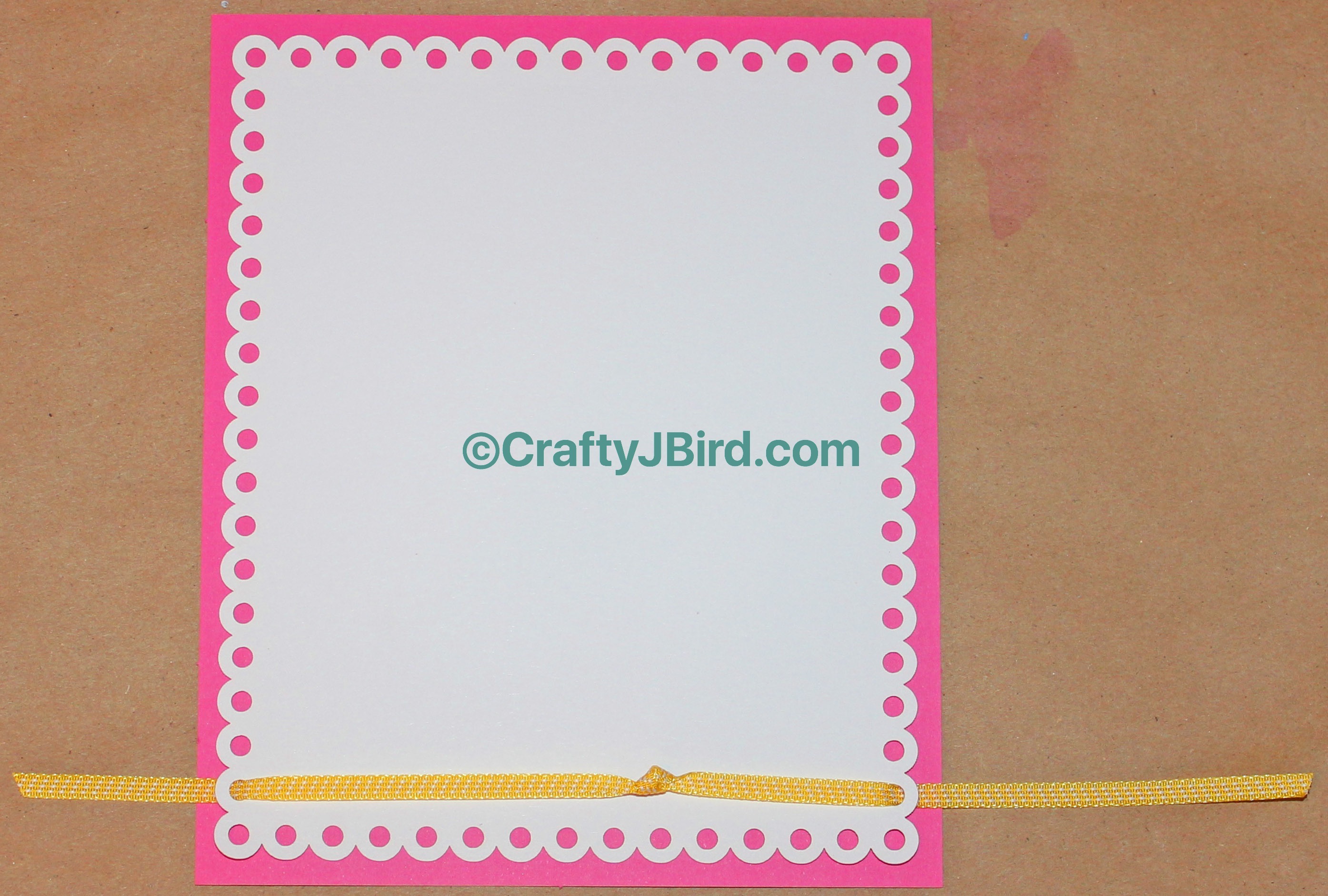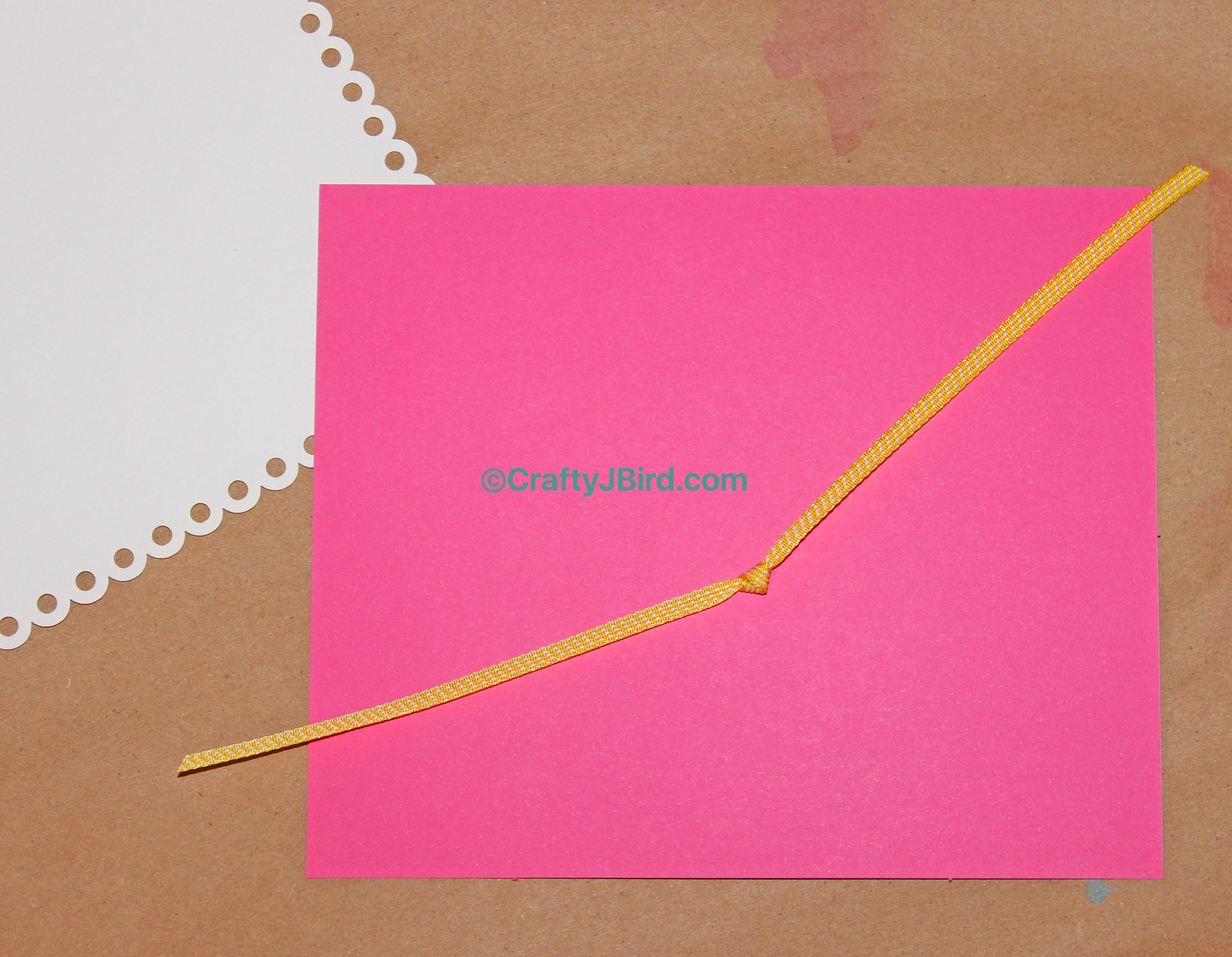 Before placing the last and final piece on the left side page, I attached the ribbon to the piece. To do that, I first tied a knot around the middle of the ribbon. Then I inserted the ends in a hole on either side the piece. Finally, I used my adhesive to secure the ribbon in place on the back of the piece. Once my ribbon was in place, I adhered it to the pink piece and then adhered it to the left side page.