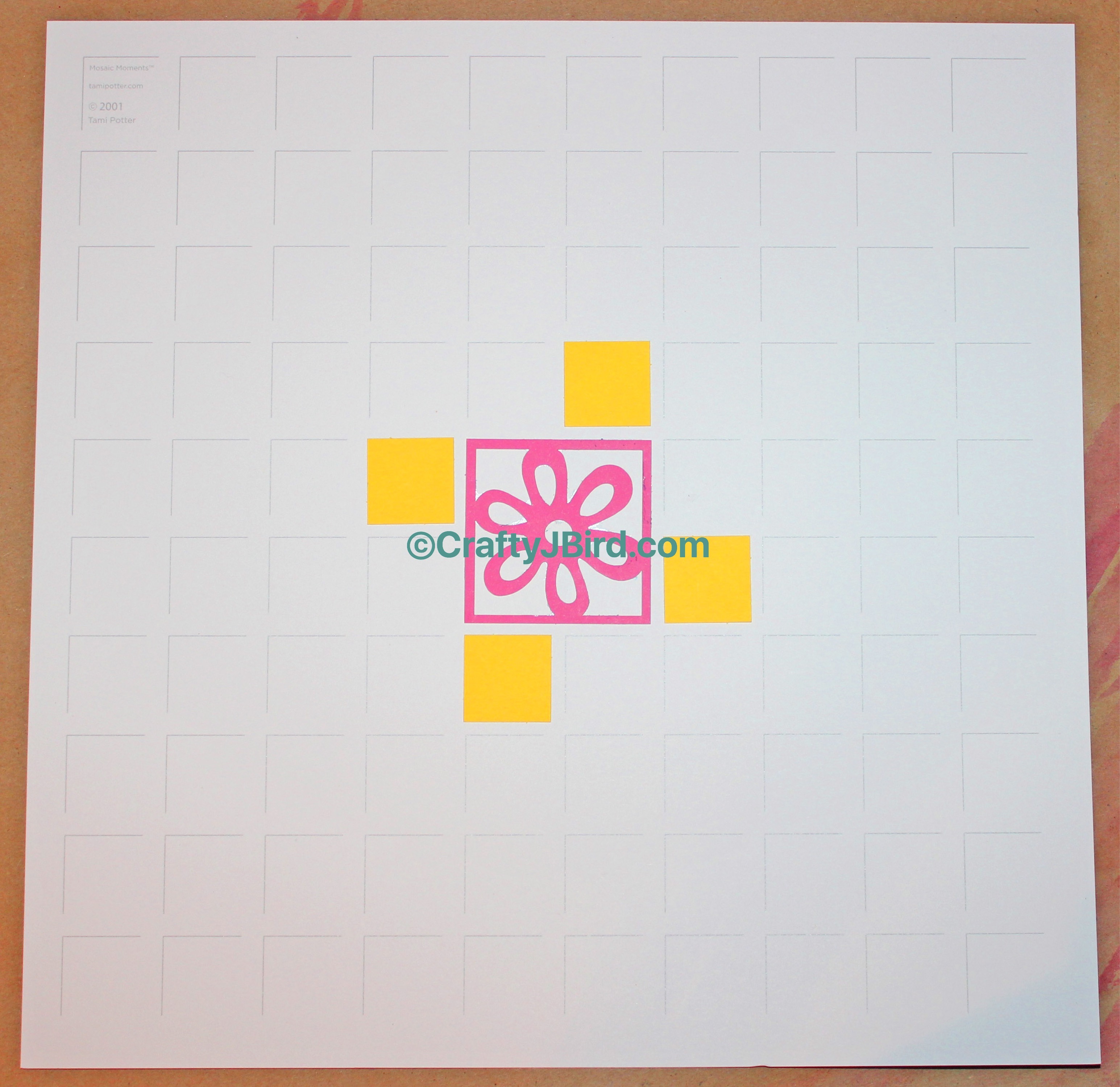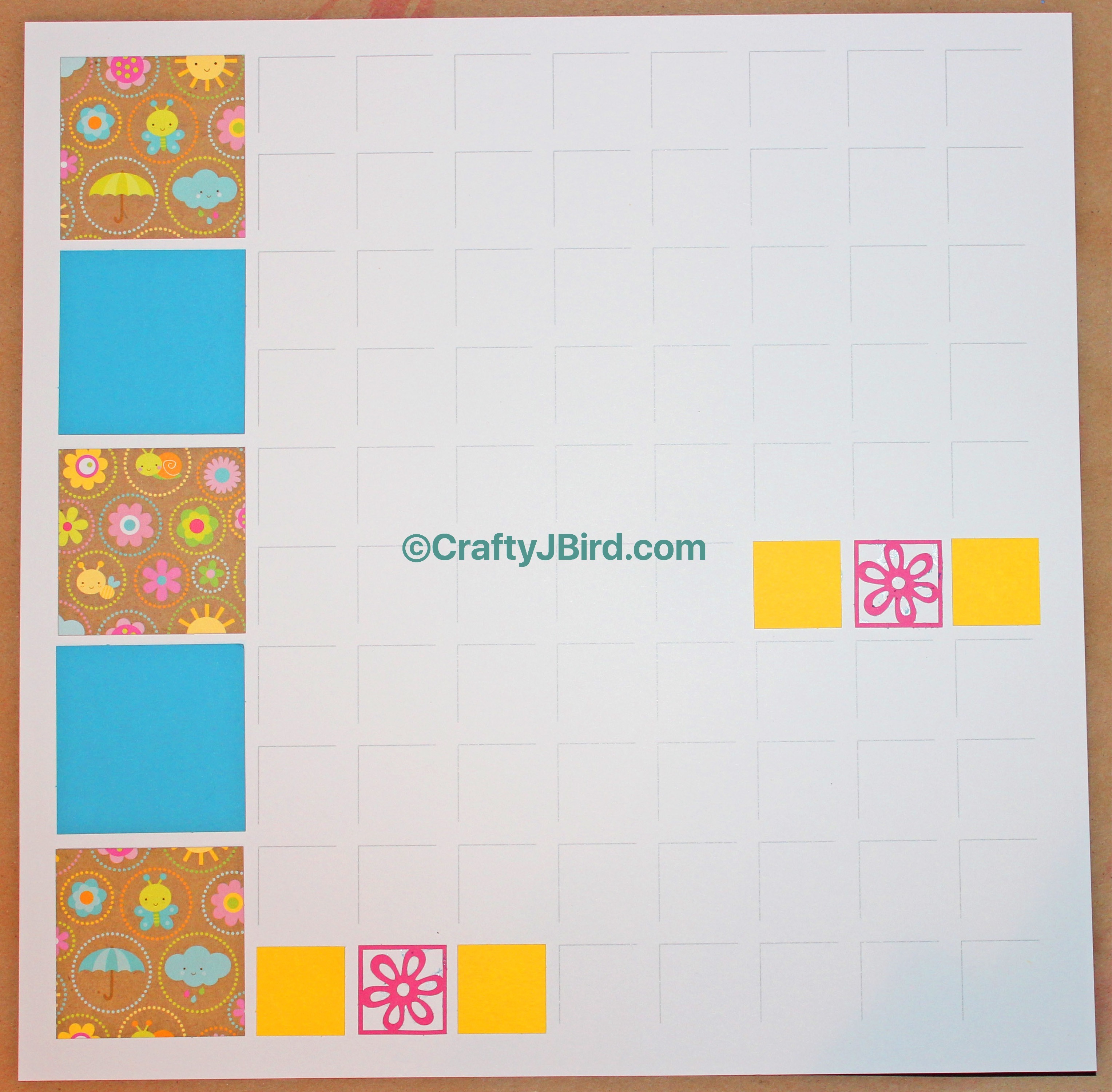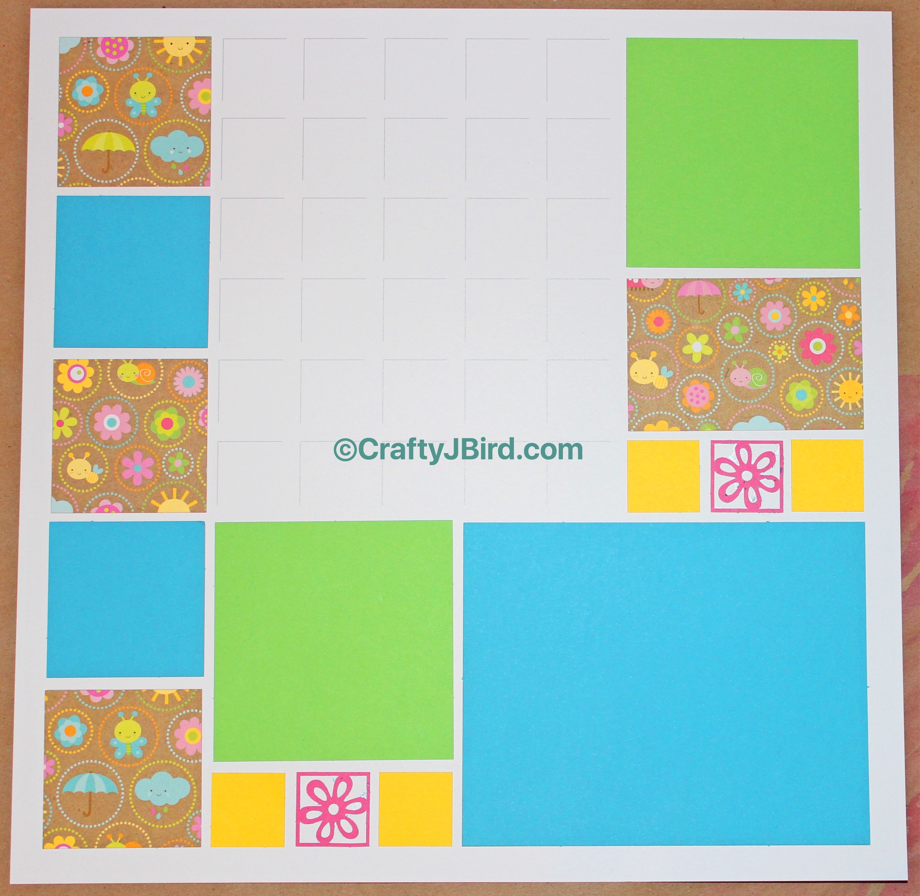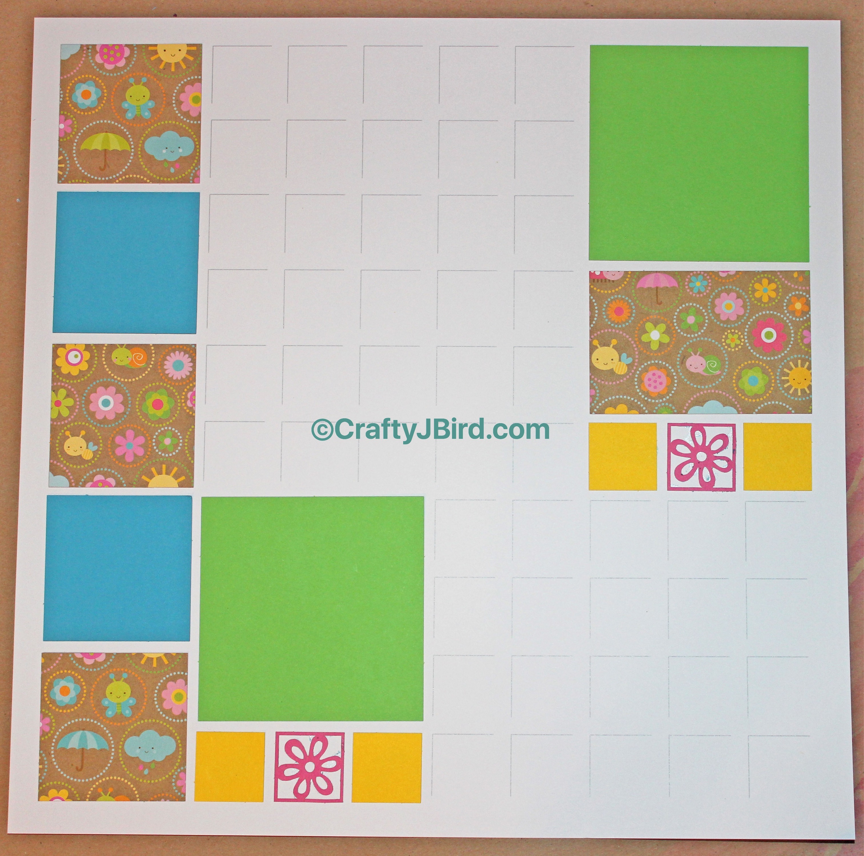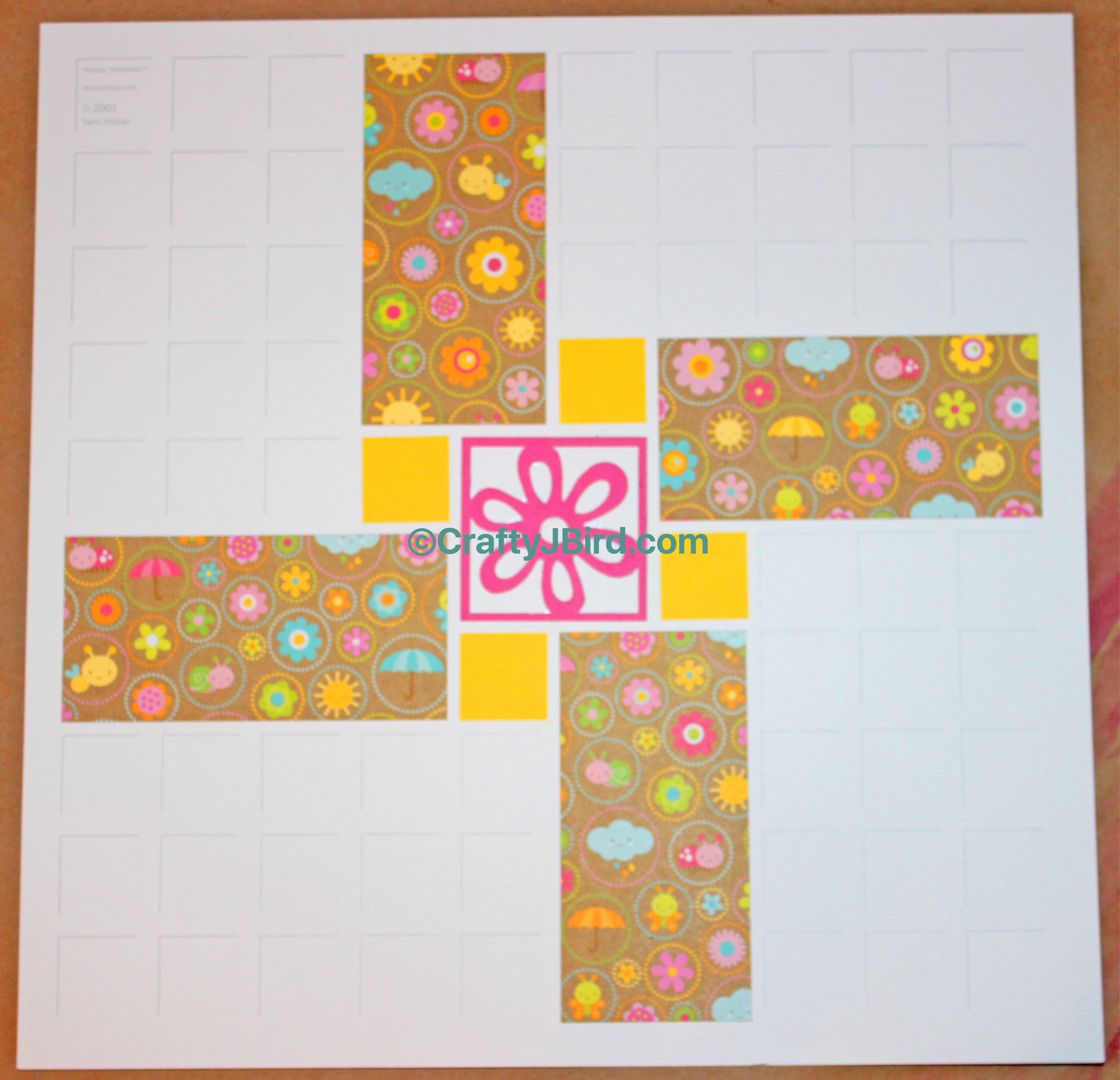 As usual, I placed the smallest pieces on first. The small flowers for this layout didn’t have a piece to back them with anything like the large one does here. So, when putting it in place, I had to be sure to line it up along the lines well.