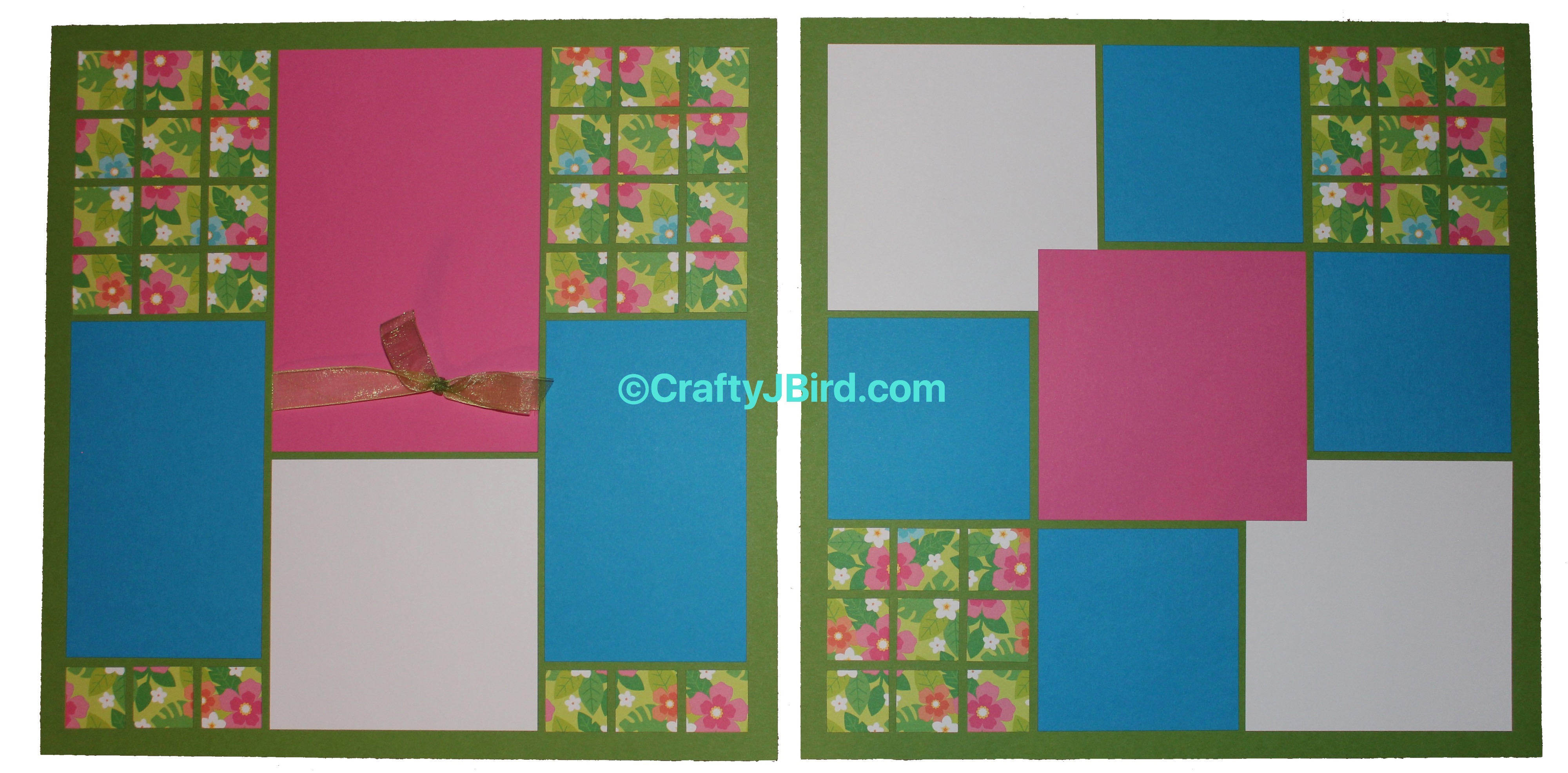 Once I got my ribbon in place I finished my double page layout but putting the remainder pieces in their place. I placed the piece I added my ribbon to on the left side. For the right side, you will notice the pink piece overlapped the white pieces. That’s the way they made the layout so it’s okay.