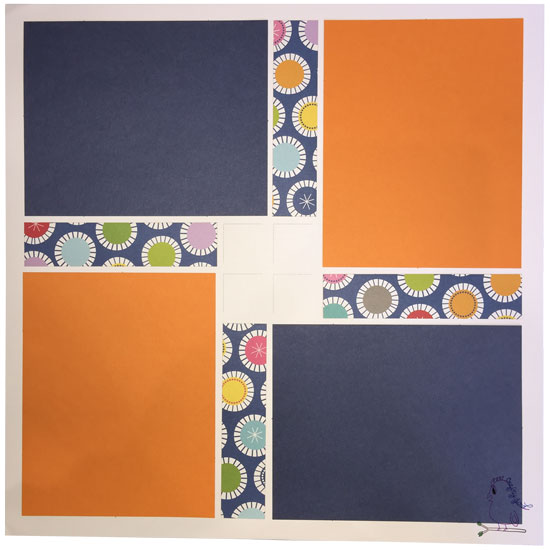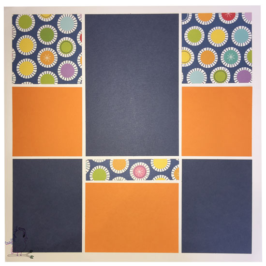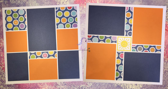 With all my solid color cardstock pieces in their spots on the pages, I then placed pattern pieces in place on both sides of the double page layout.