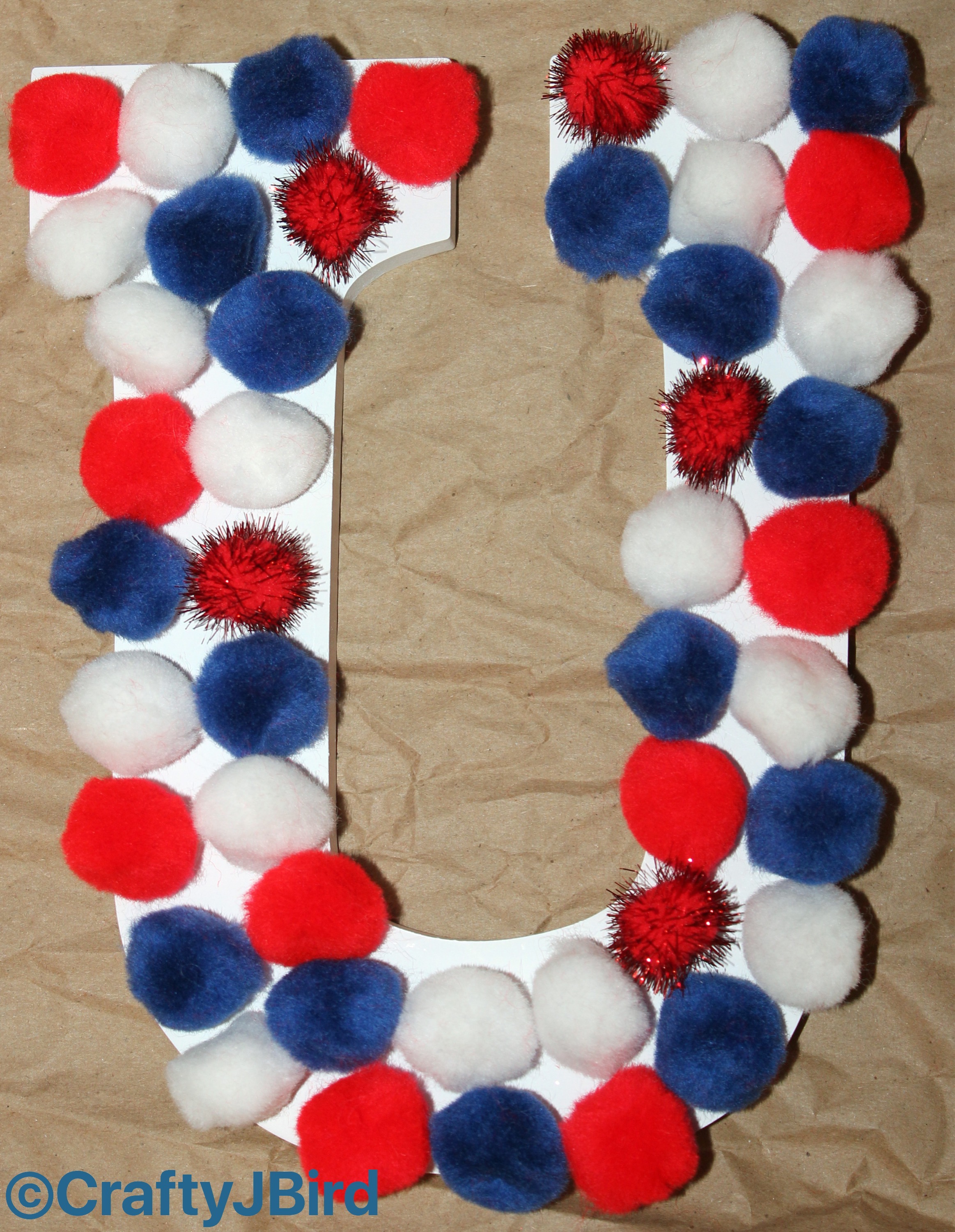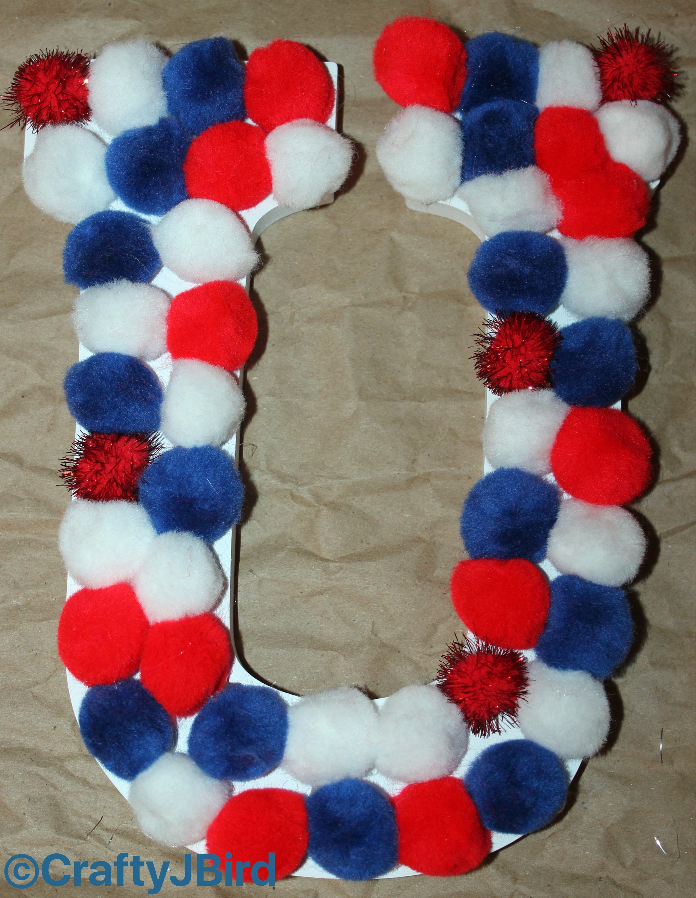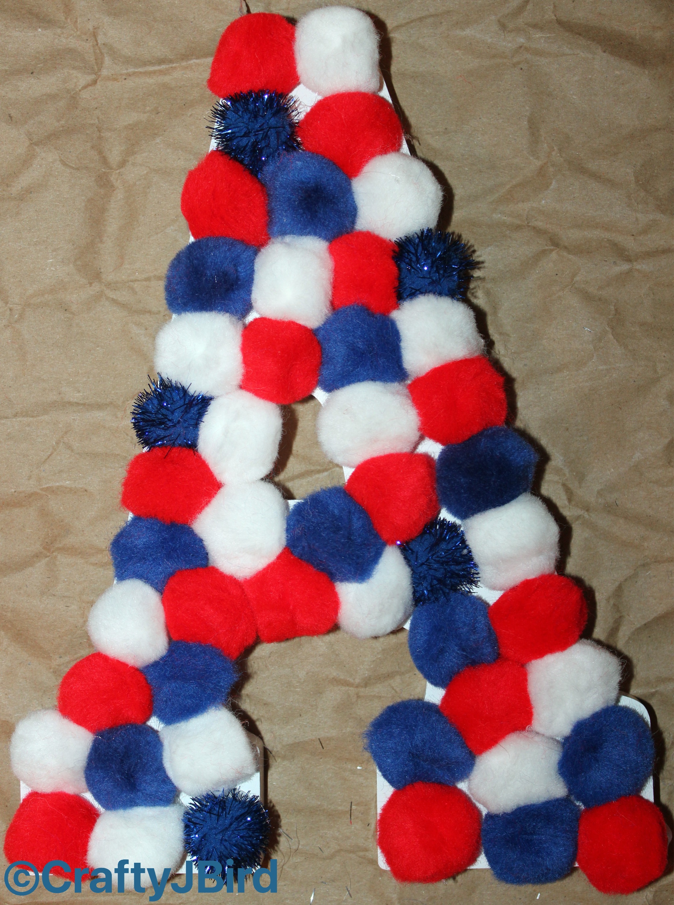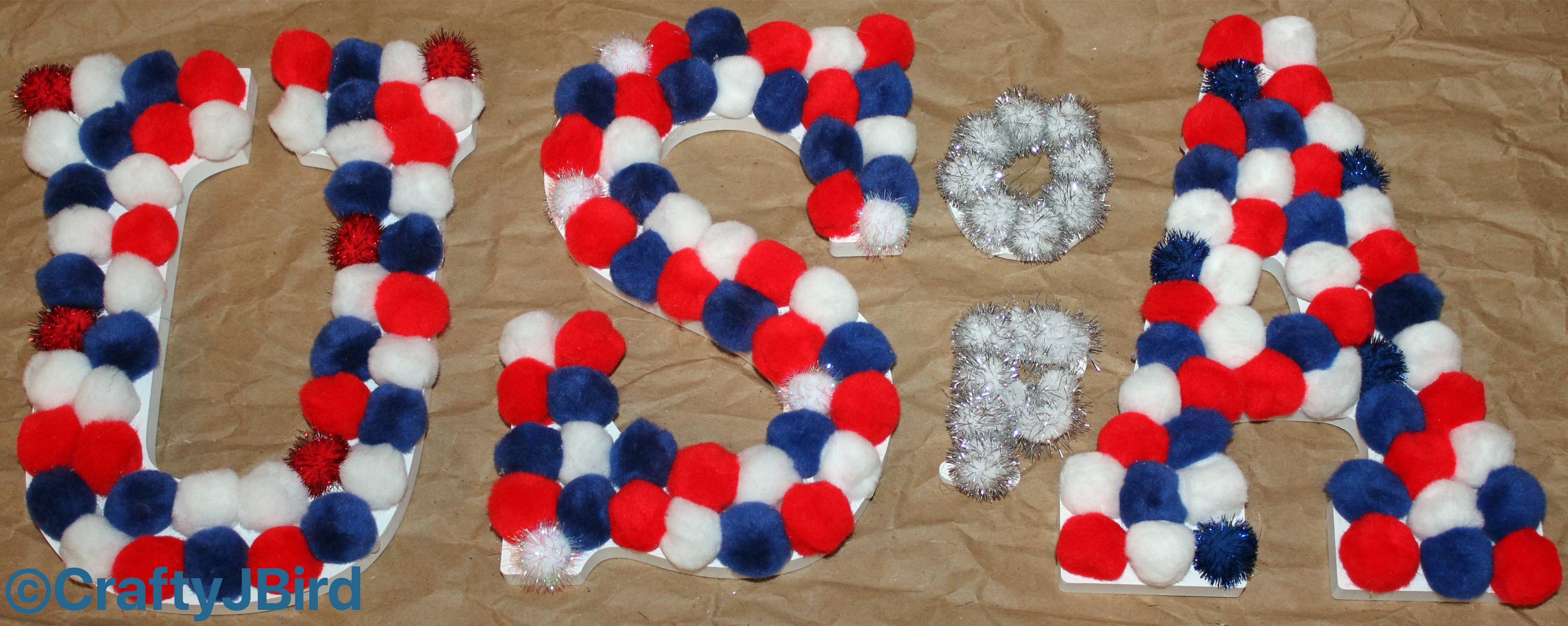 Lay out Red, White and Blue Pom Poms the way you want them on each letter as shown. Careful as some of the ones I have tended to repeal each other like magnets. As you can see on the letters ‘o’ and ‘f’ I used the small Silver Pom Poms.