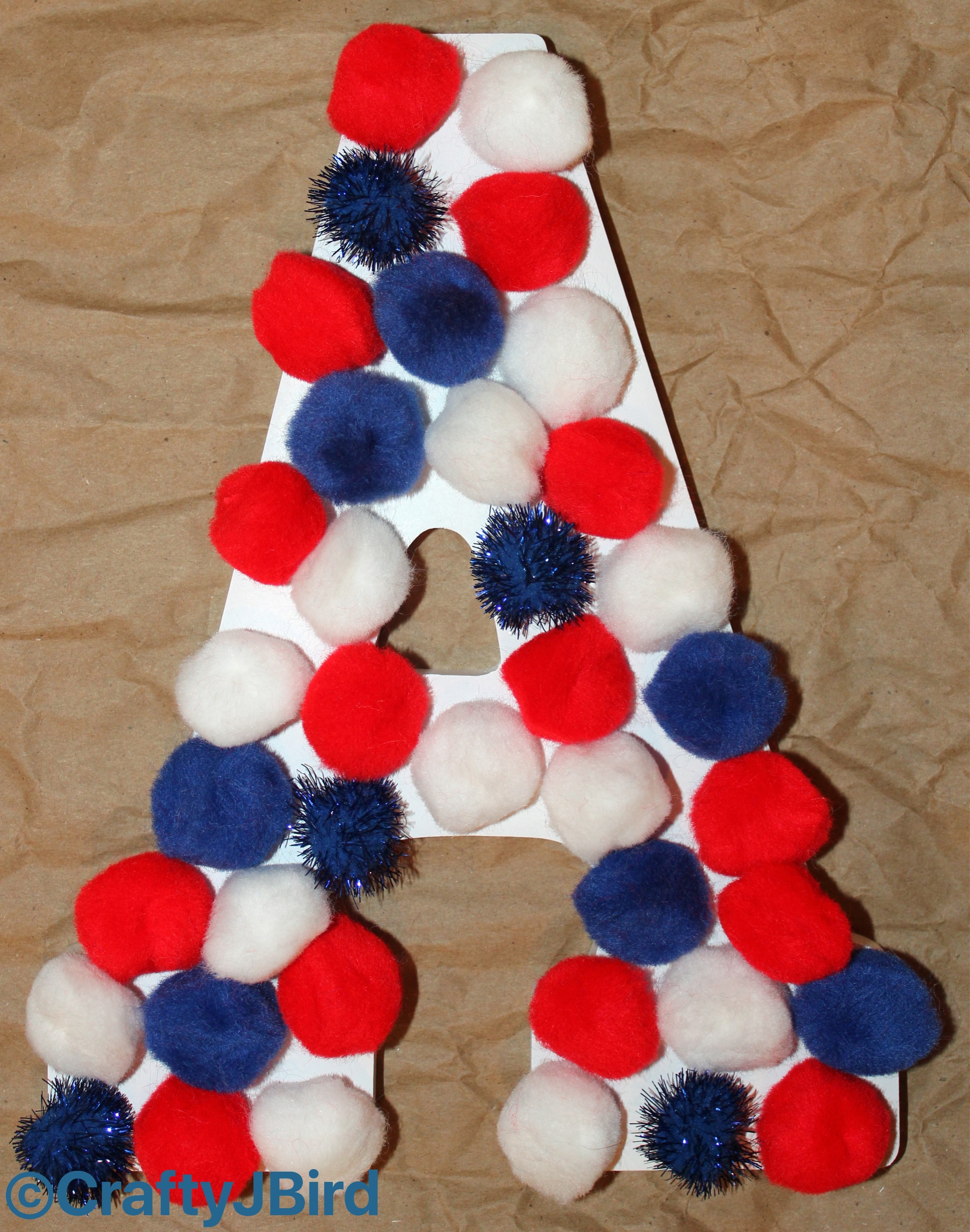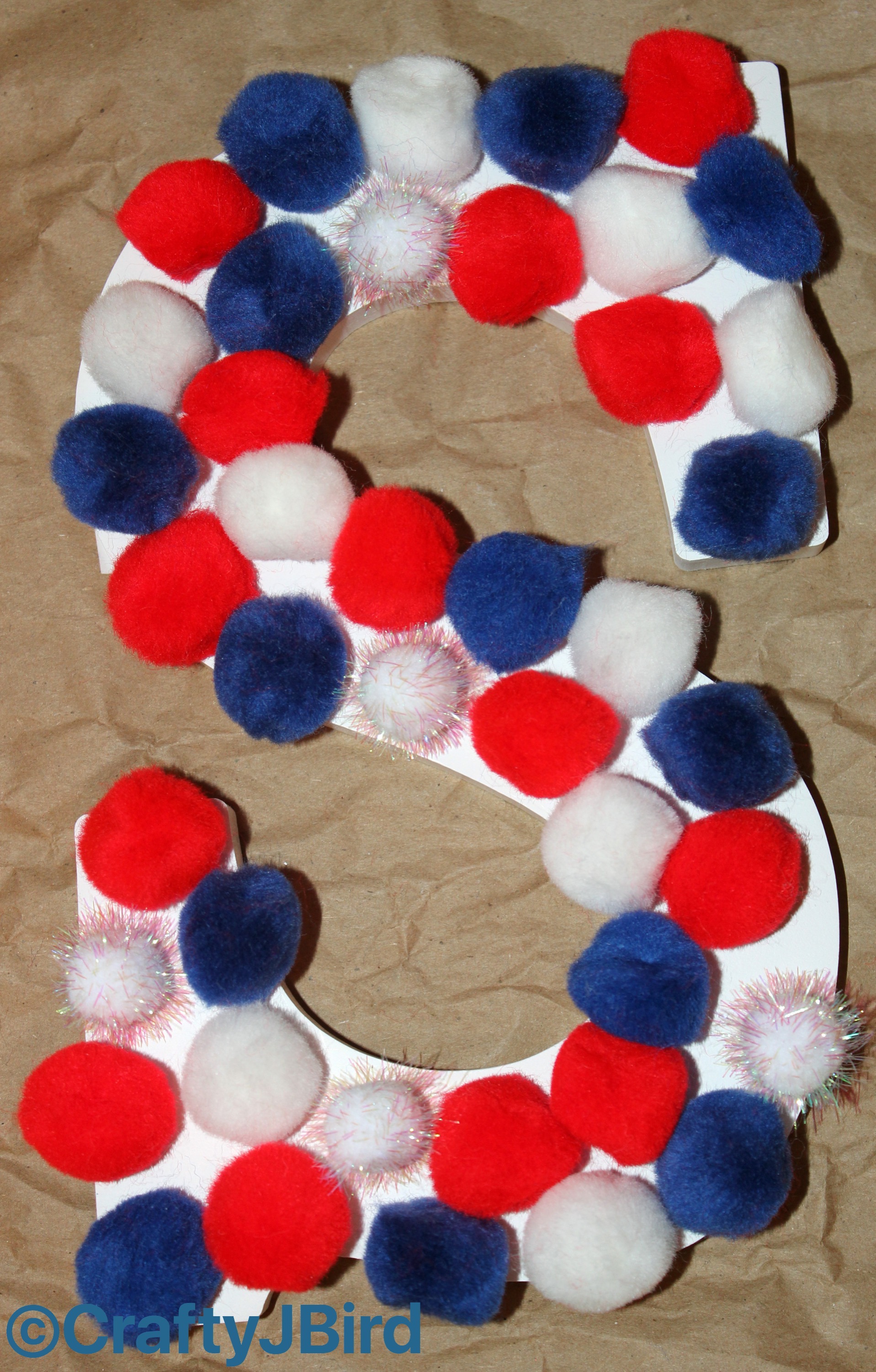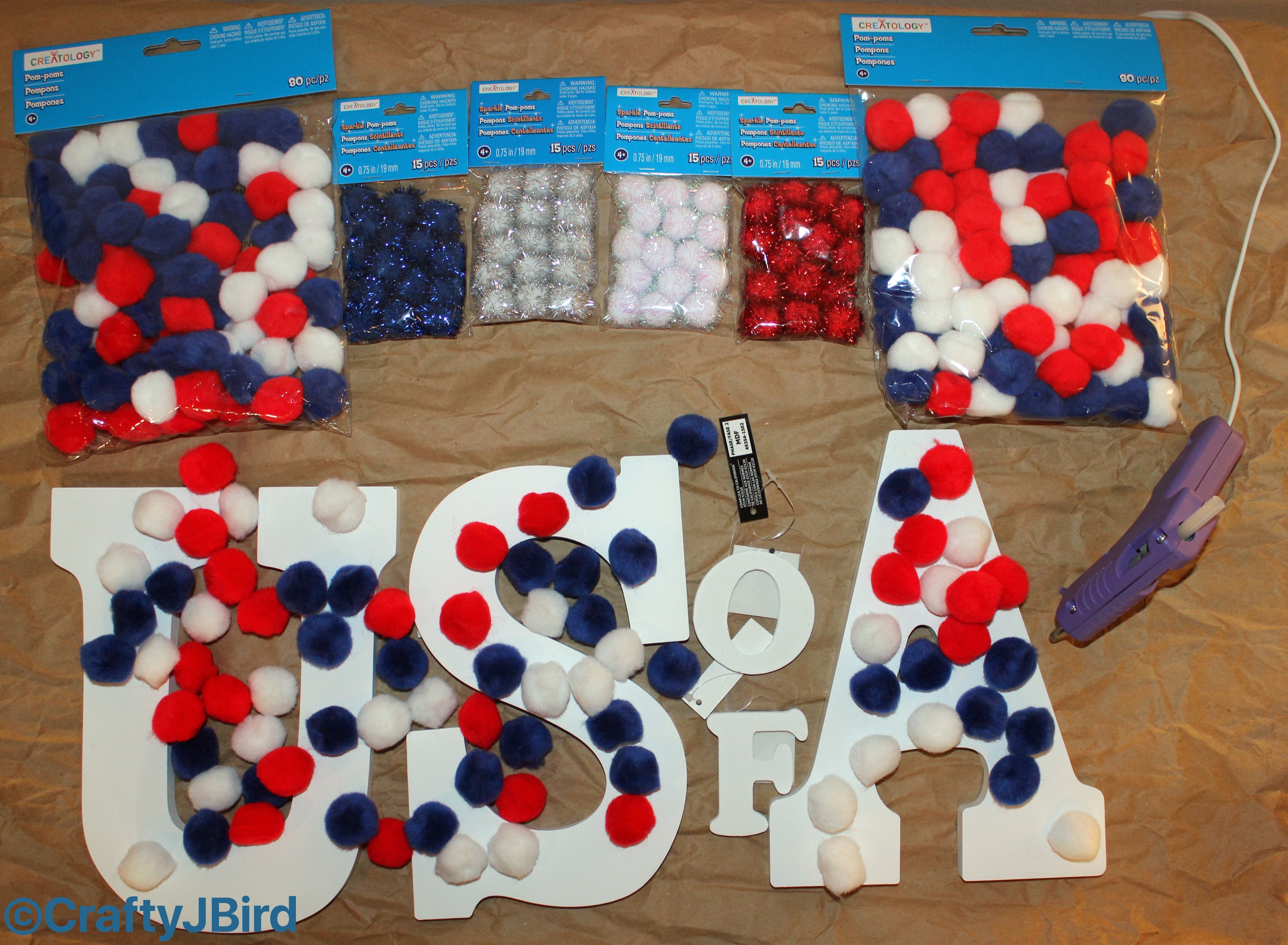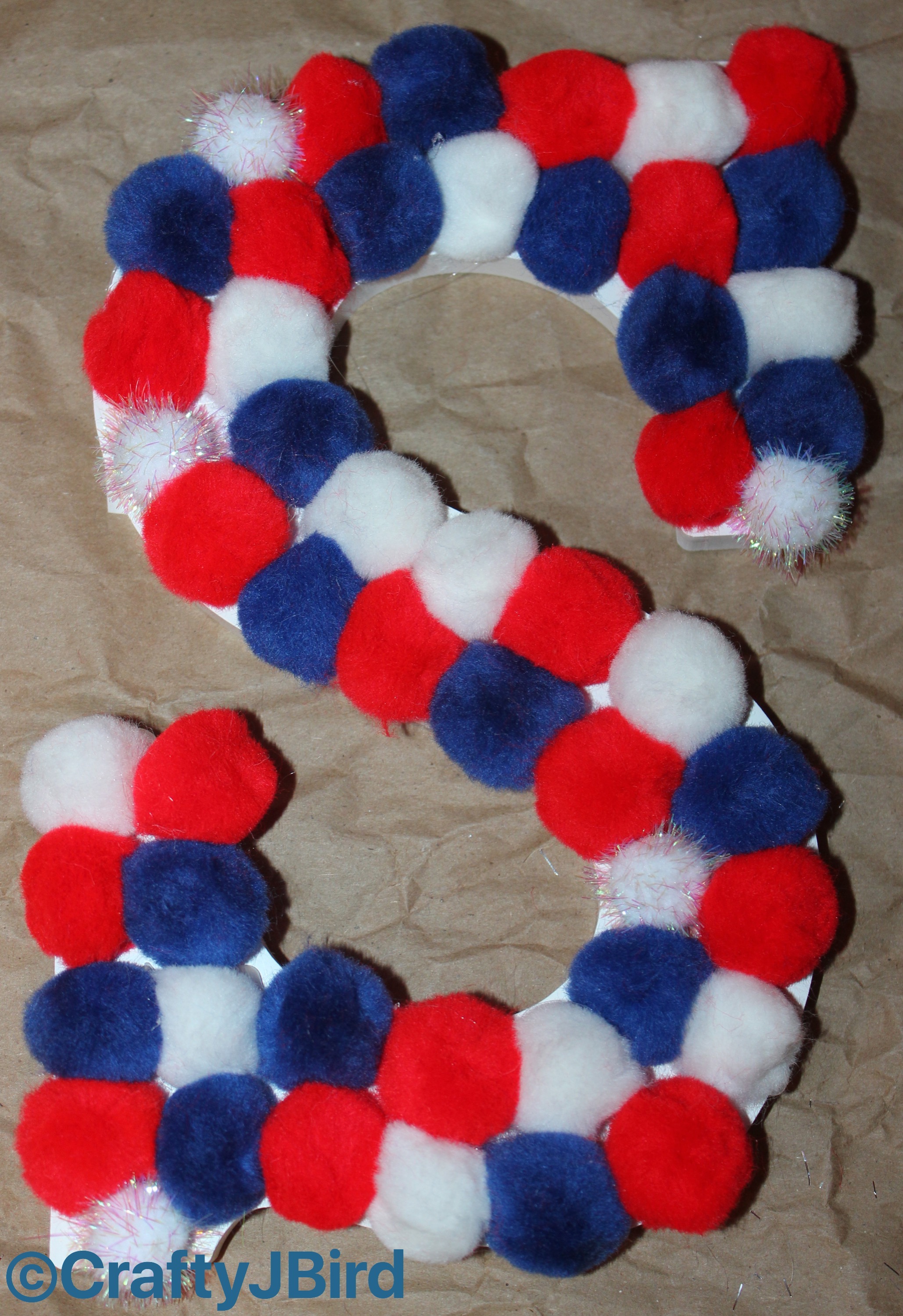 Lay out Red, White and Blue Pom Poms the way you want them on each letter as shown. Careful as some of the ones I have tended to repeal each other like magnets. As you can see on the letters ‘o’ and ‘f’ I used the small Silver Pom Poms.