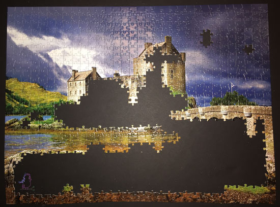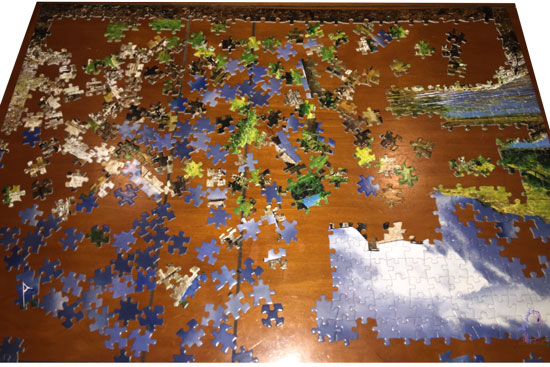 When I finally finished the clouds, I was able to work a little faster. Unfortunately, due to the bottom pieces looking so much alike, I literally had to rearrange most of them; of which by this time I was so determined to get the puzzle finished I forgot to take pictures of that part.
