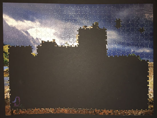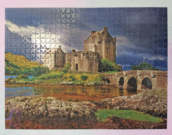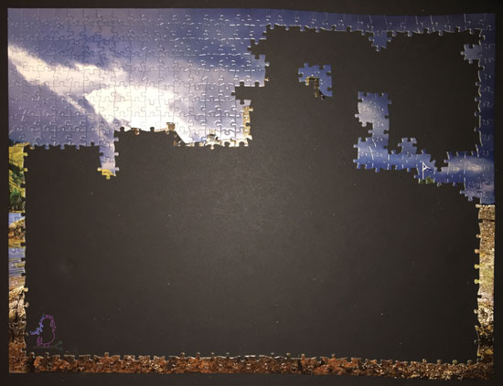 After I finished my border outline pieces, I worked on putting all the cloud pieces in place. Needless to say, this puzzle was not easy since they all look so much alike. The three empty spots you see in the clouds, I could not for the life of me get the three pieces I had left to fit. Finally, I figured it out as I had to switch out a few pieces with one another even though they did ‘fit’ together.