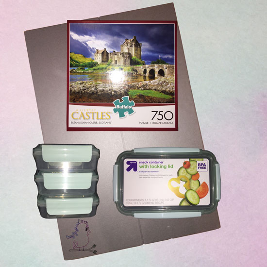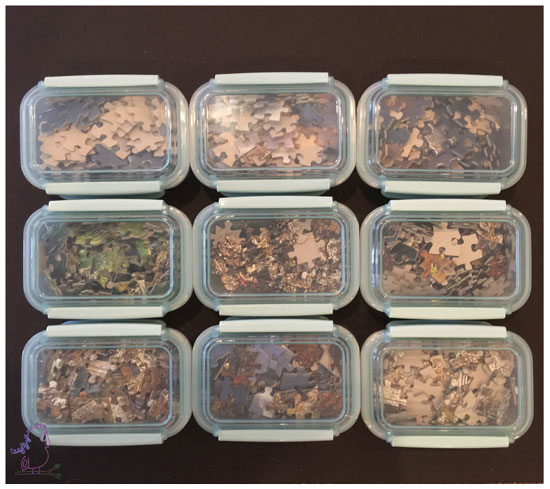I purchased the Black Board from Michaels (coupon y’all coupon!) and purchased the snack containers from Target. They were like $2-4 and compared to what actual ‘puzzle sorting containers cost’ so much better. For the puzzles, click on the links above to purchase off Amazon.com. The Kaleidoscope Coloring Puzzle one I actually got for Christmas a few years ago, just never have taken the time to put it together until now.