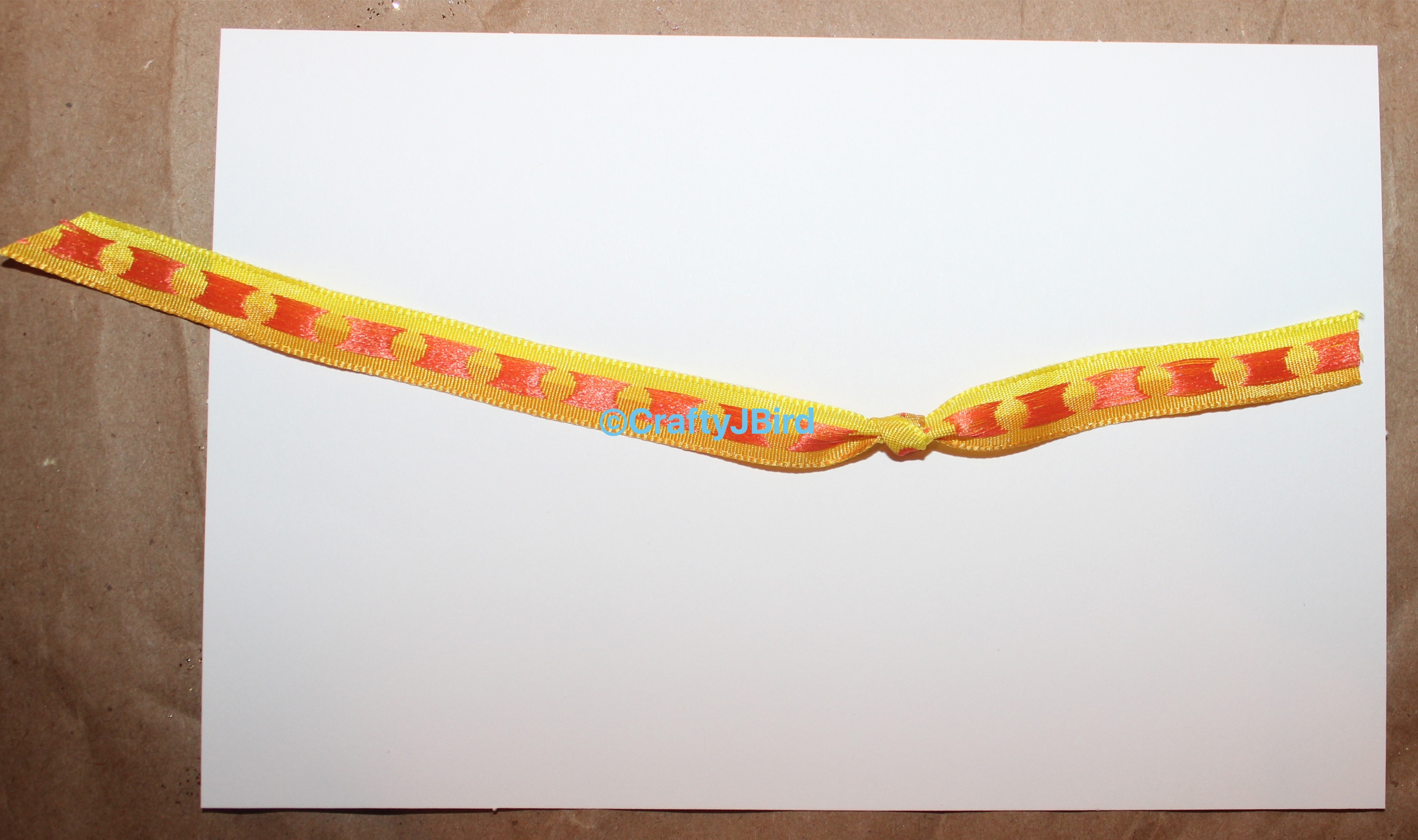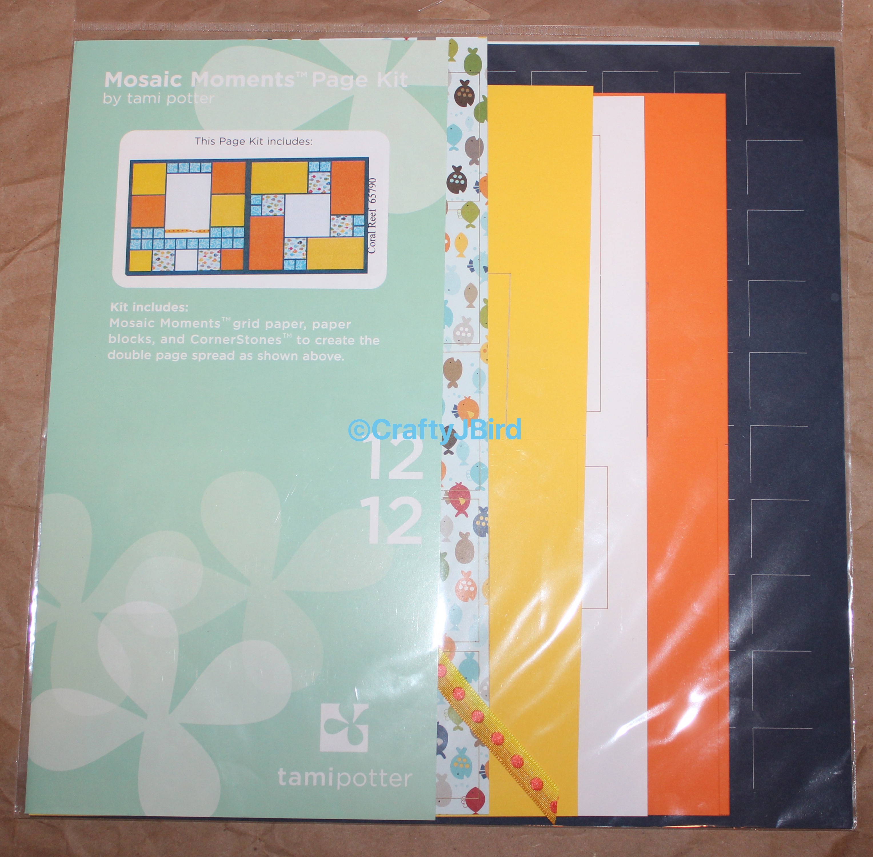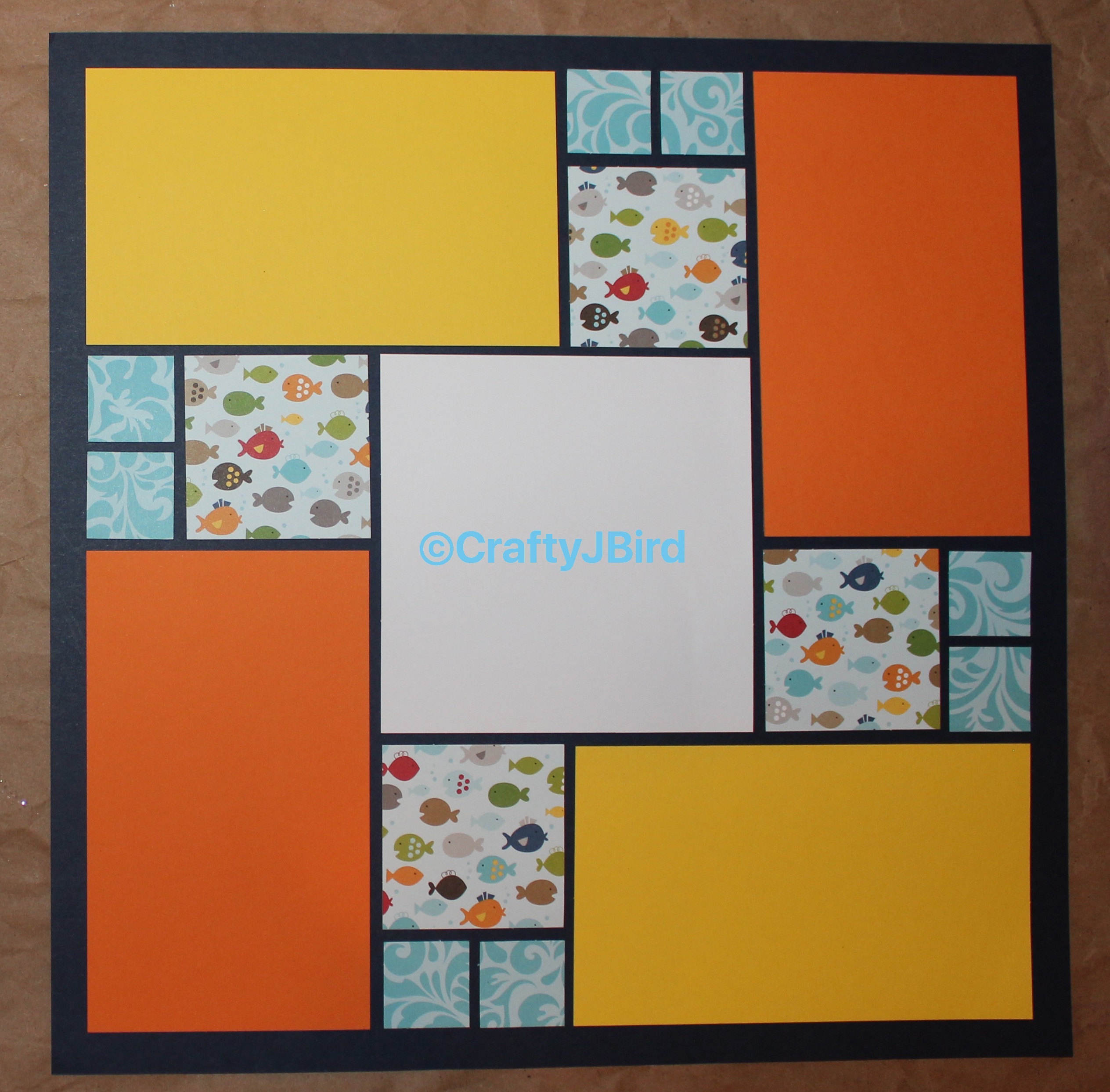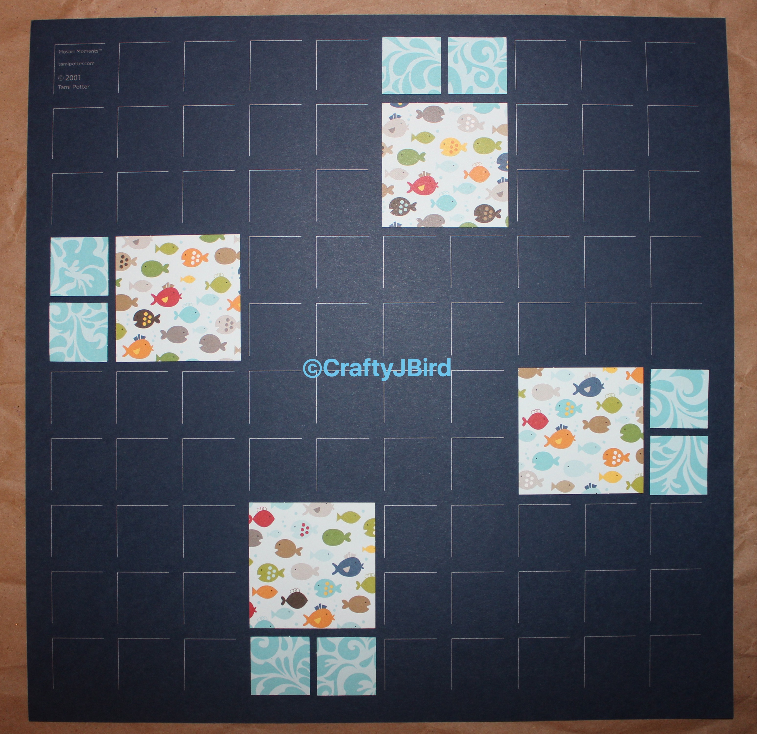 Lay all the pieces out. For this particular kit named “Coral Reef” item #65790, you’ve got your colored pieces — yellow, orange, and white and you’ve got your pattern pieces — the fish and water splash type pattern. Just be sure you don’t poke the smallest pieces out, especially if you’re like me of wanting all the pieces to match like a picture. I think these pages look neater when they are done like that. Some may not care but “Snap ‘N Crop” pages are also well-known as “Mosaic Moments” so they are mosaics in a way. ? Then you have in this particular kit a piece of ribbon.
