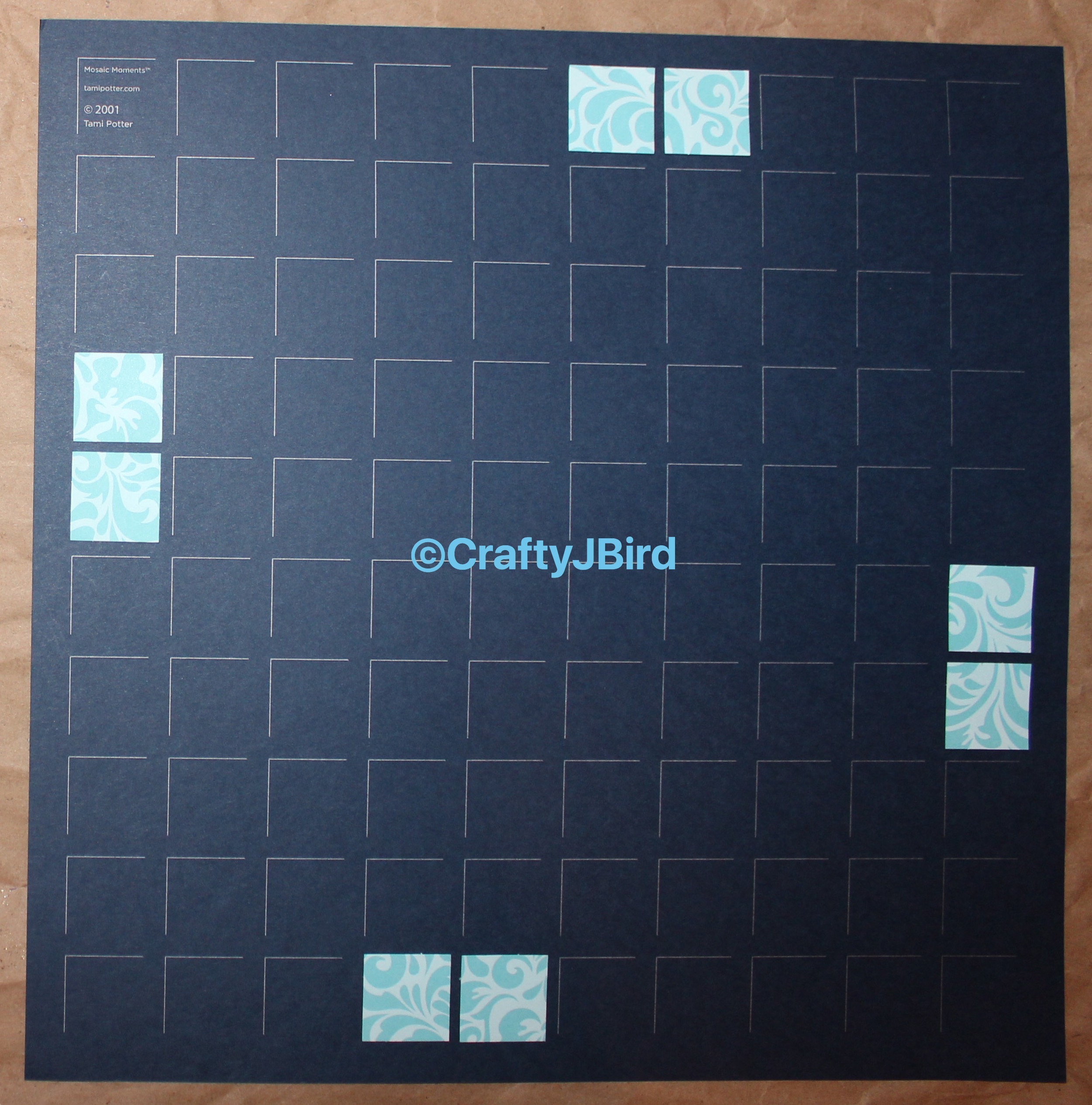 Once all my small pieces are put down, I then start adding the next size up, which are the 2 by 2 squares. First, I add the pattern pieces and then I add the colored pieces.