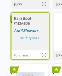 On Cricut’s Design Space I typed in the various objects I knew I wanted to use for the double page, but you can type in “rain clouds” and within the search results the objects I used will show up. The objects I used was “April Showers” cartridge “Cloud,” and “Rain Boots,” “Creativebug” cartridge” “Creativebug – Raindrops,” and “Designer’s Calendar” cartridge “Umbrella.”