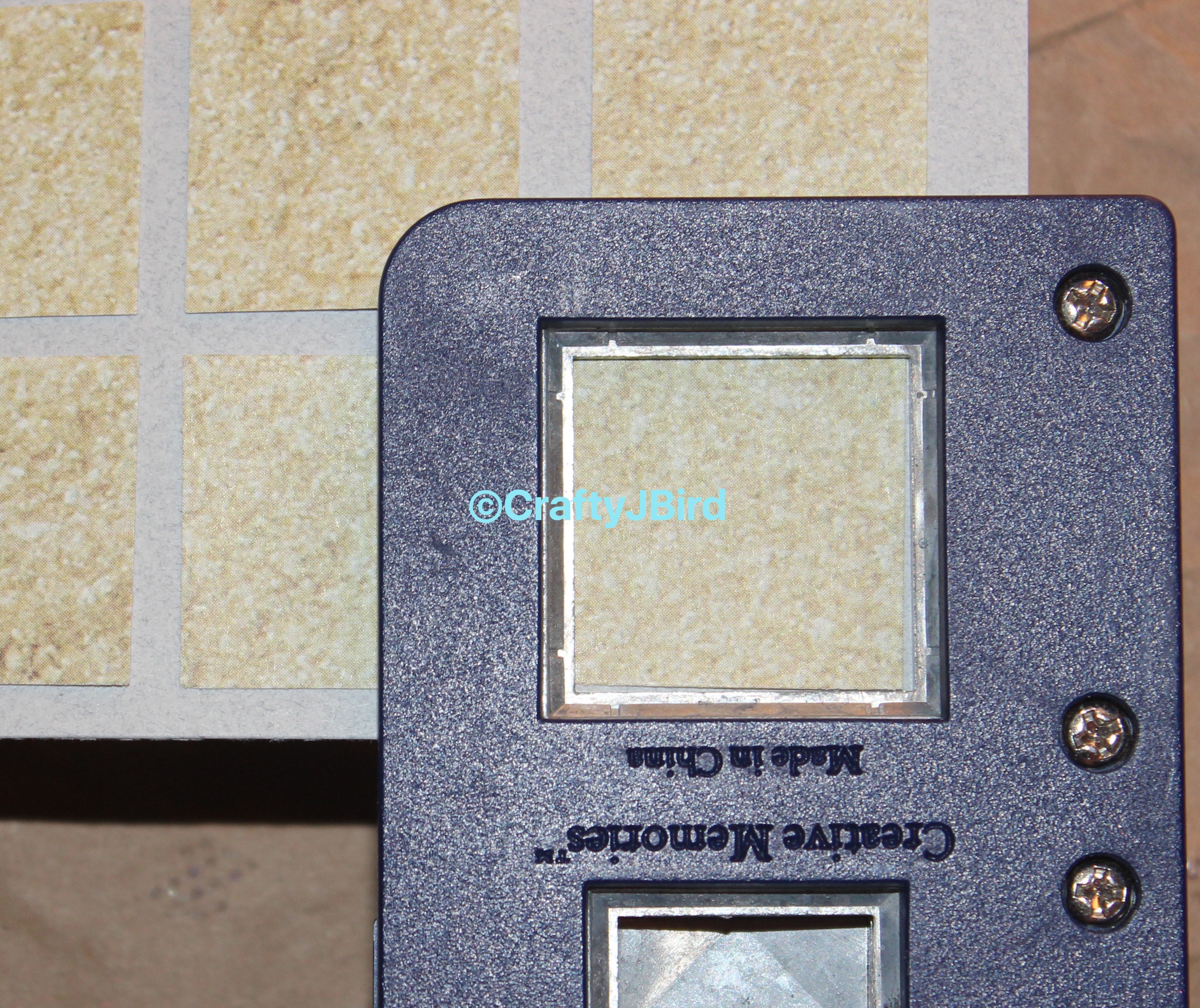 Sandy Beach -- Visit CraftyJbird.com for more info  Sandy Beach -- Visit CraftyJbird.com for more info               Using my Creative Memories® 1″ square punch, I punched four squares in my blue cardstock to go in the middle of the four pictures on the right side page. Then I punched out enough in my sandy paper to go around the middle picture on the left side page. I believe the blue cardstock is some from Close To My Heart and the Sandy Paper came from Hobby Lobby.