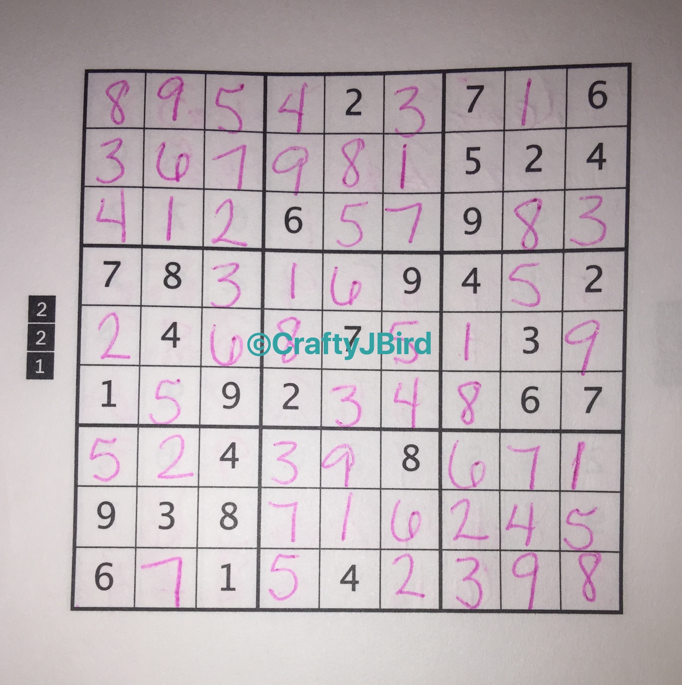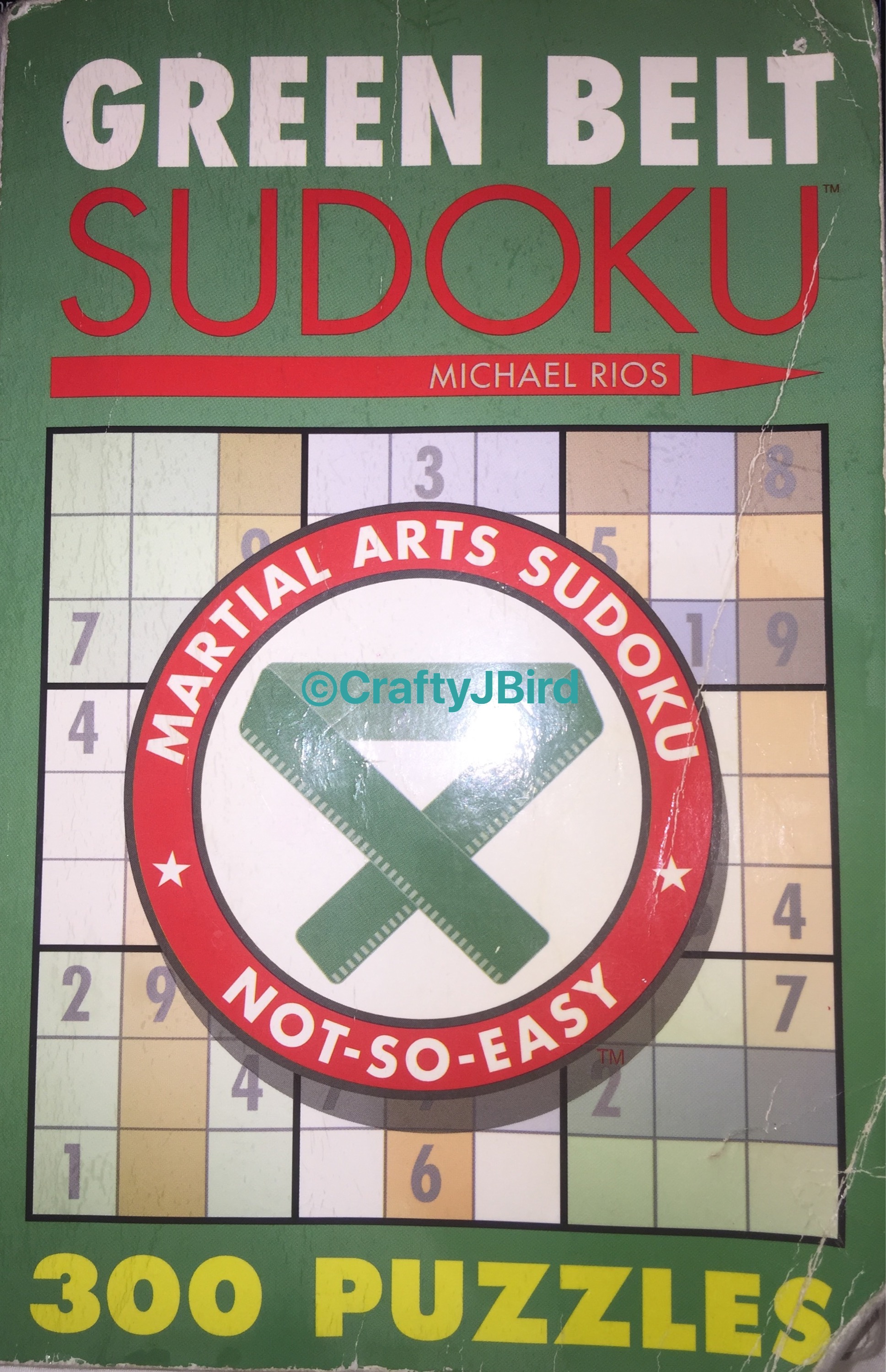 Sudoku -- Visit CraftyJBird.com for more info... It wasn’t until 2012 when I was introduced to this game and I still have my book of games I started that summer. During the last 3-4 months I have been working more on them since I randomly found the book and got distracted. Some are definitely harder than others. Sometimes I get frustrated where I have to put it away and come back to it. It’s by Michael Rios and is the “Green Belt Sudoku: Martial Arts Sudoku Not-So Easy – 300 Puzzles” version.