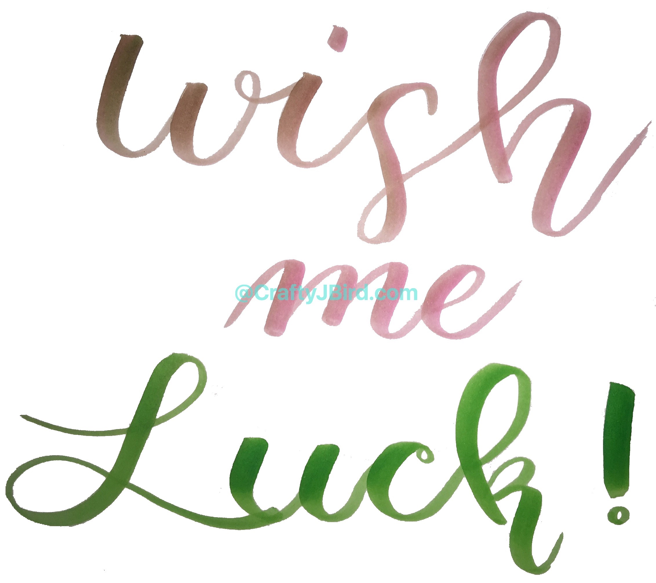 Finally, blending together my two Tombow Dual Brush pen numbers 195 and 703, I brush calligraphy out ‘wish me’ with 703. Then brush calligraphy out ‘luck’ with 195.