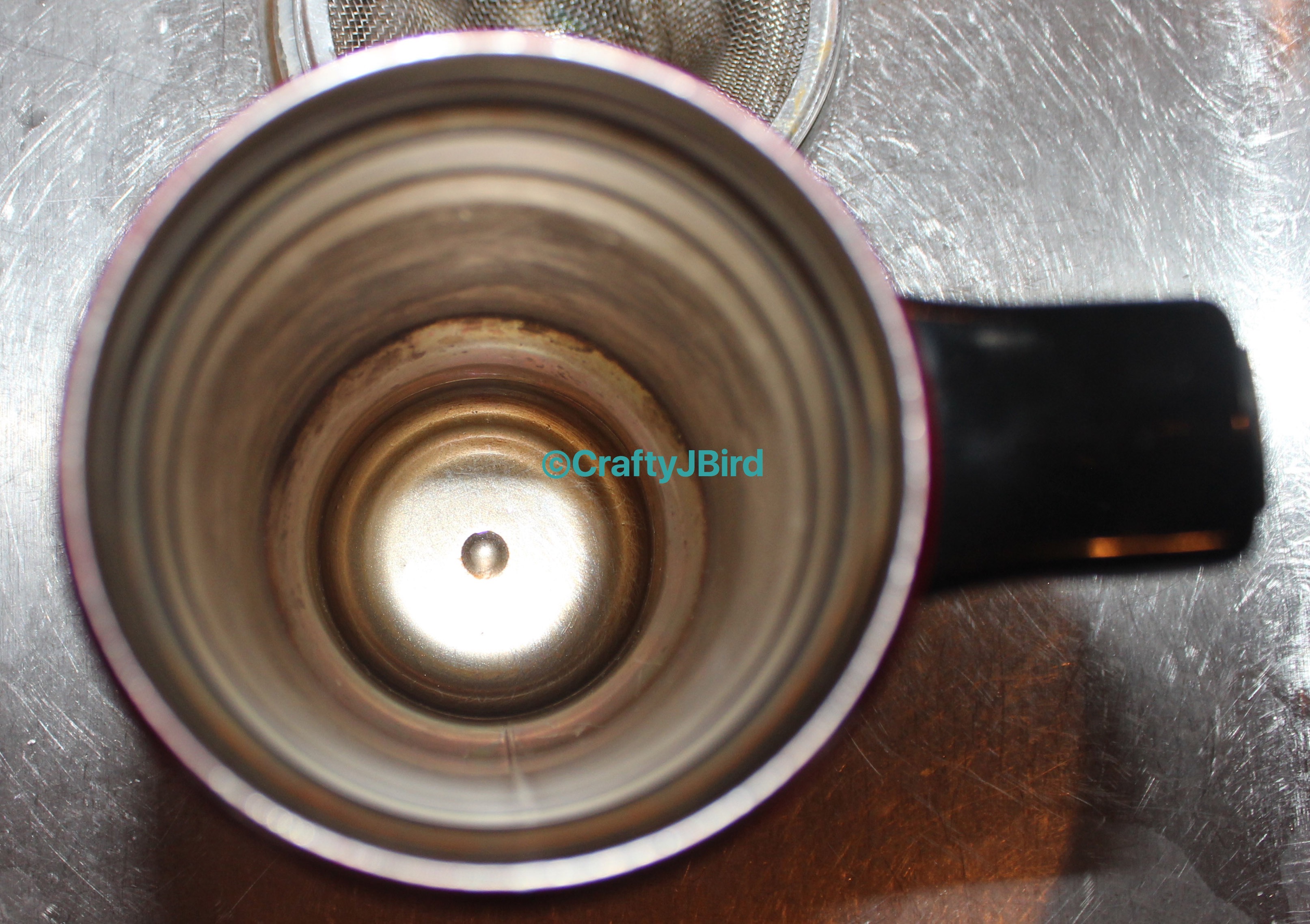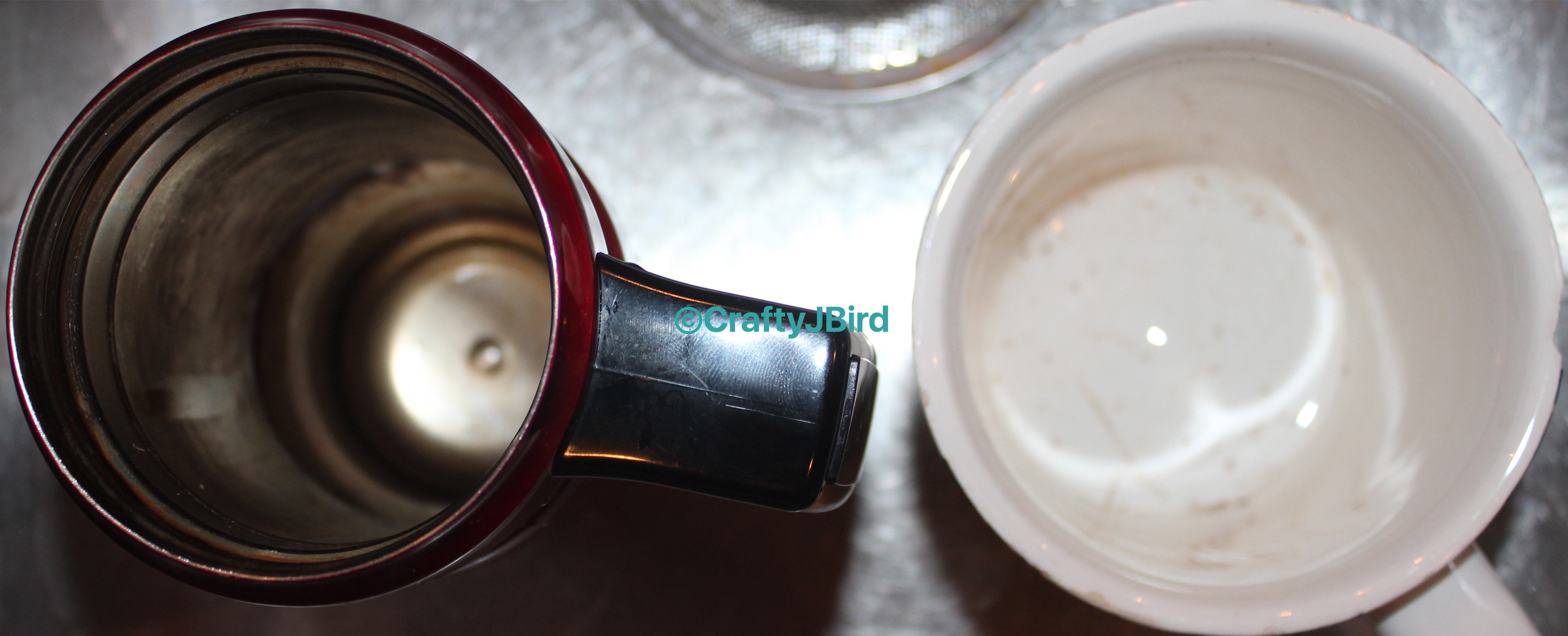 For cleaning my tea cups with stains in them I simply fill the cup up with hot water and add some straight up thieves cleaner. Depending out how bad the stain is, I either leave it in there for 10 minutes or I let it sit for 30 minutes. Sometimes I’ll pour it out use a napkin to take away what I can and repeat. Above are a couple pictures of my tea cup and my mom’s before adding the thieves cleaner.