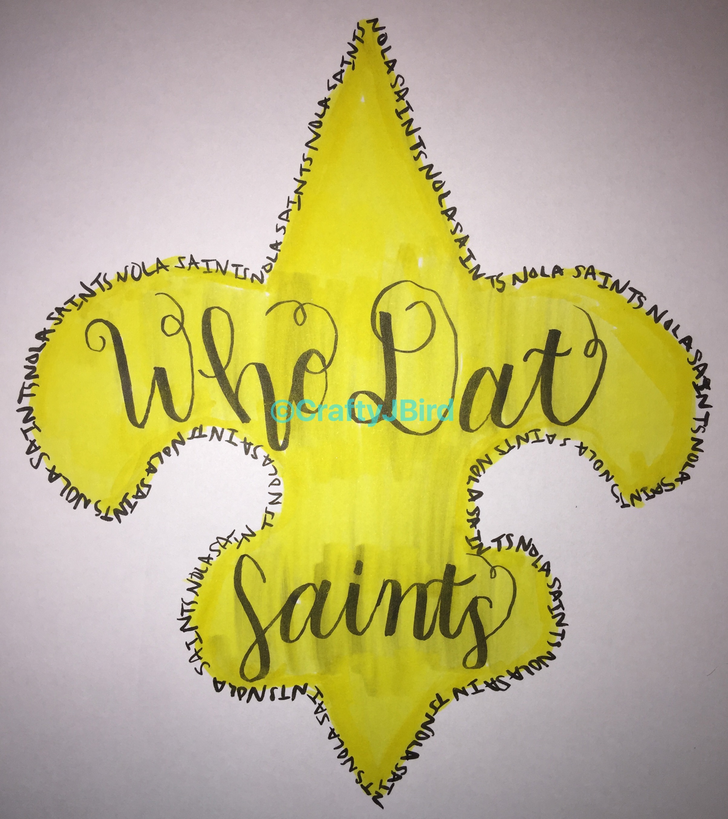 Be sure to visit my Instagram for the awesome video I made making this awesome work! I think it came out pretty good considering. To make I used Tombow Dual Brush Pen #055 as the Yellow fill-in color. I then used Tombow Fudenosuke Hard Tip for writing “NOLA SAINTS” used Tombow Fudenosuke Twin Tip for the writing in the middle “Who Dat Saints.”