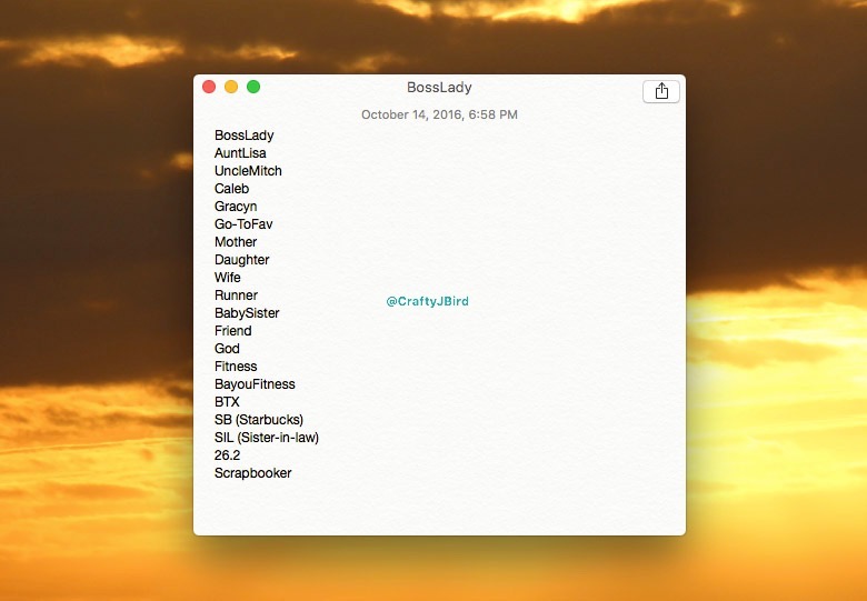 Word Cloud -- Visit CrafyJBird.com for more info.. The first thing I did was came up with words to describe my aunt. After playing around with the words I wanted to use I originally found a website I thought I might could use and then download the .SVG file; but, I then decided against using what I had found basically because I didn’t want to spend the money.