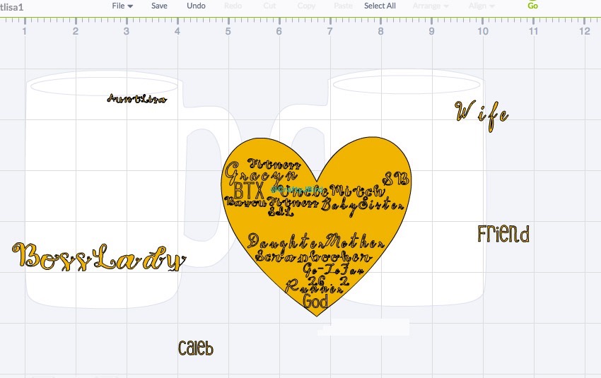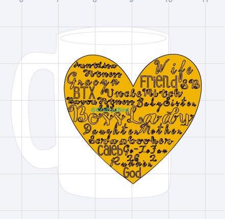 Word Cloud -- Visit CrafyJBird.com for more info...Once in Design Space, I picked out my shape I wanted to use, which ended up being a heart. To make use of the canvases they have to help measure things out, I picked out the coffee mug to use as a measurement of what size to make my word cloud.